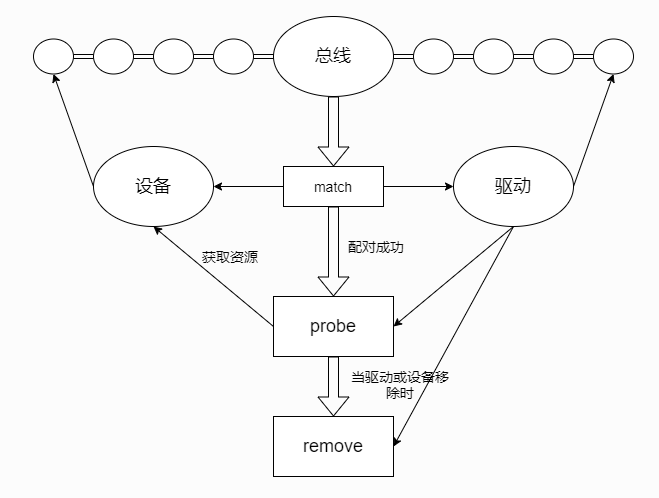 在匹配成功的时候会调用驱动device_driver结构体中probe方法(通常在probe中获取设备资源,具体的功能可由驱动编写人员自定义), 并且在移除设备或驱动时,会调用device_driver结构体中remove方法。