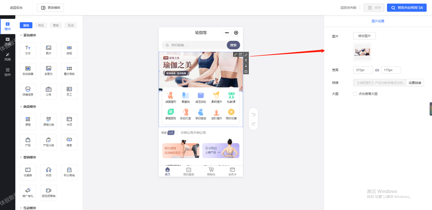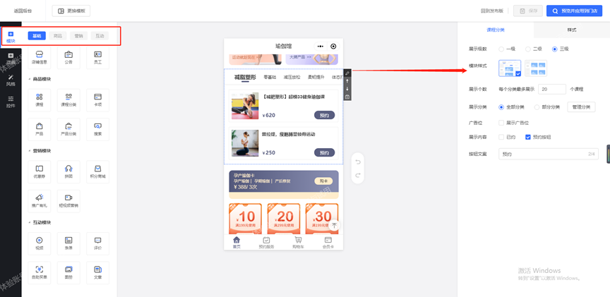 - 选好模板后,即可进行编辑修改与设置。可直接点击模板中要修改的内容,像文字、图片、功能模块、底部导航栏等都能修改。还能通过左侧的【模块】【页面】【控件】【风格】选项完善设置。在【模块】选项里,能添加店铺信息、公告、员工、课程、卡项、产品、搜索、优惠券、拼团、推广有礼、短视频营销、自助买单、评价等功能到小程序店铺,直接拖拽功能至模板指定位置即可完成添加与设置。在【页面】选项中,可对模板各页面进行设置完善,还能制作添加新的小程序页面。