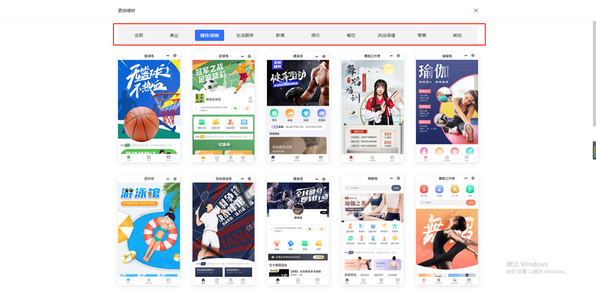 - 在后台管理页面,点击【店铺装修 - 更换模板】,挑选心仪的小程序店铺模板。美业、健身瑜伽、生活服务、娱乐、餐饮、零售等行业都有合适模板可选。