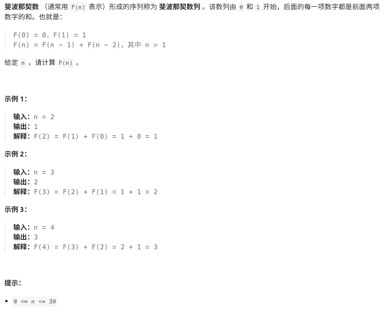 public:int fib(int n) {//边界处理if(n==0) return 0;if(n==1) return 1;int a,b,c;a=0;b=1;for(int i=2;i<=n;i++) {c=a+b;a=b;b=c;}return c;}