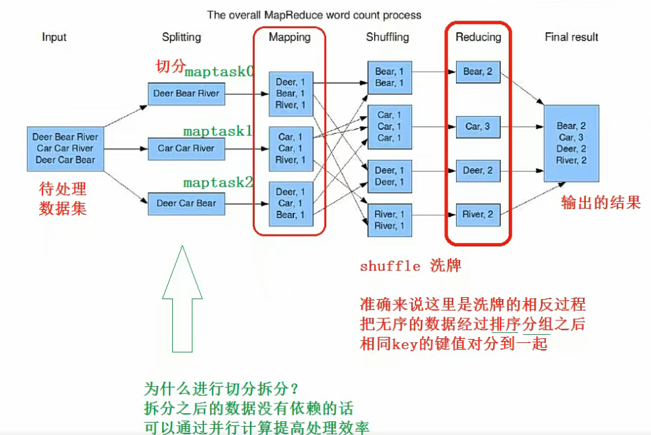 经过shuffle把相同的单词分为一组,把对应的value进行累加,输出的结果就是该单词出现的总次数