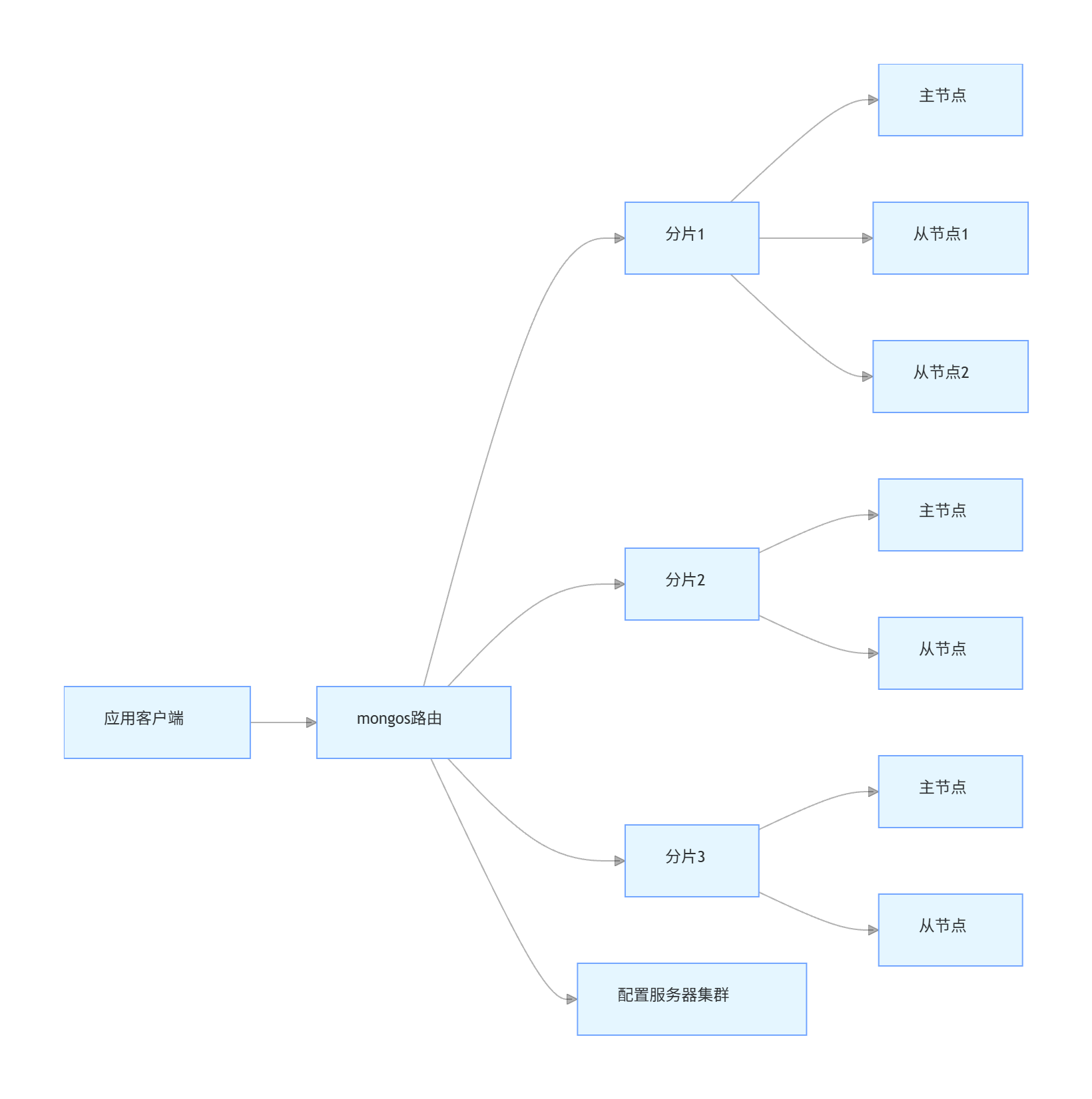 对于大规模应用,单节点 MongoDB 难以满足性能需求,需要采用集群架构: