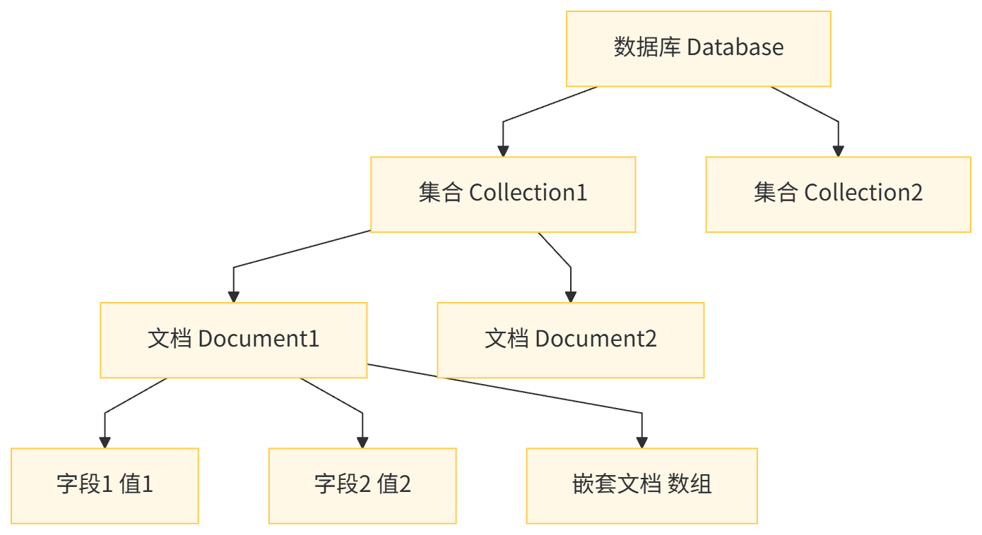 MongoDB 的基本存储单元是文档,多个文档组成集合,多个集合组成数据库。其逻辑结构如下: