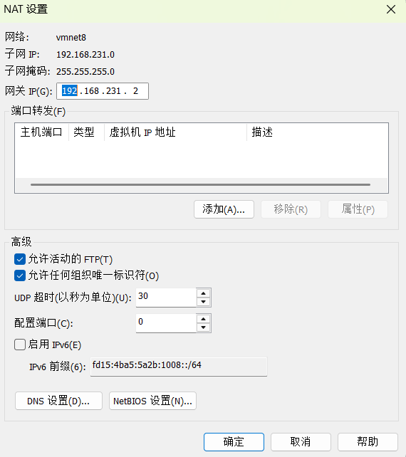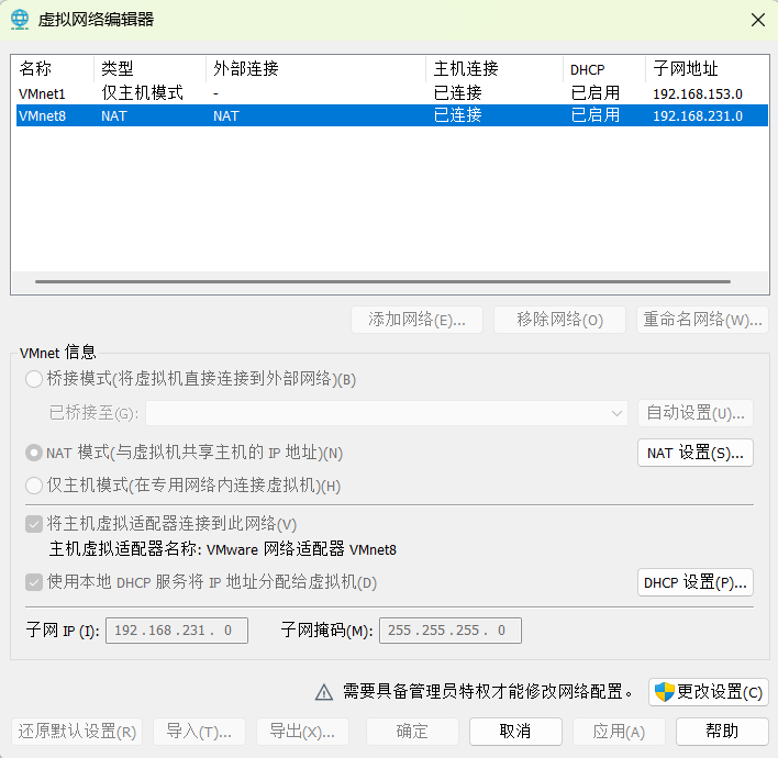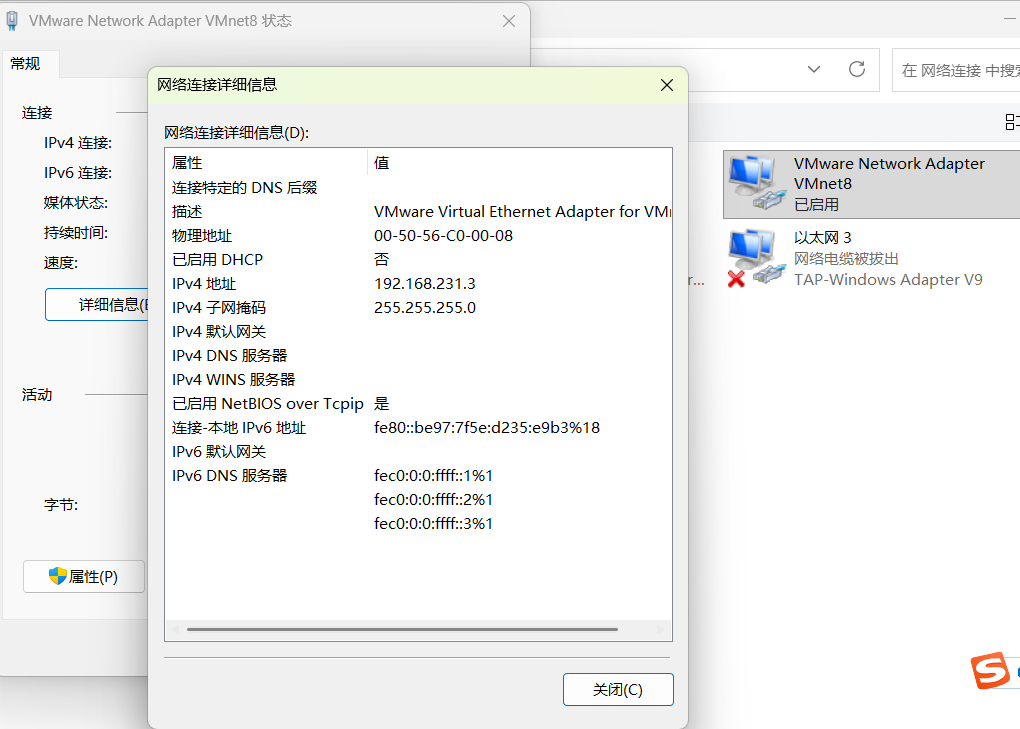 这个虚拟网路接口自动生成的一个ip中跟VMnet8的IP地址冲突了,自动生成了一个192.168.231.1的地址,而现在VMnet8的地址刚好也是用的这个,之后把VMnet8的地址改为静态配置192.168.231.3,问题得以解决。