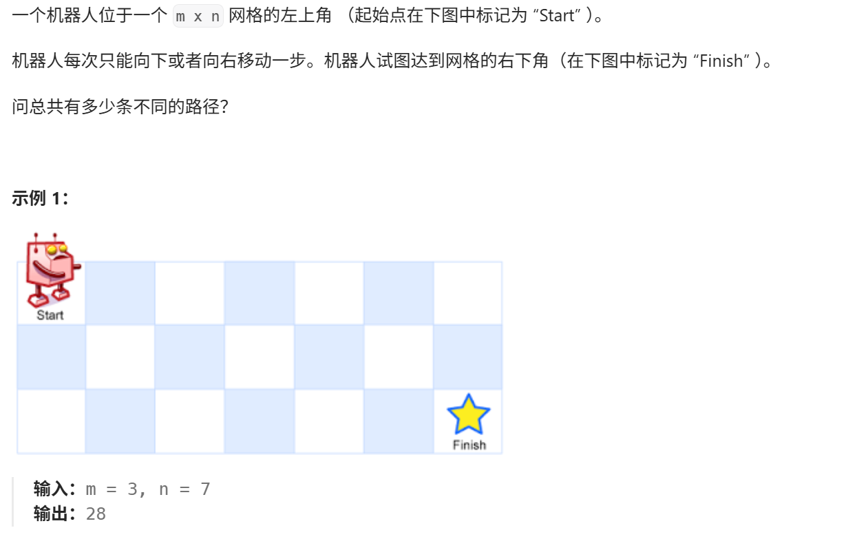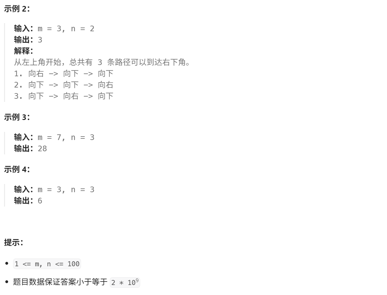 public:int uniquePaths(int m, int n) {//边界处理if(m==1||n==1) return 1;memo.resize(m+1,vector(n+1,-1));for(int i=0;i<=n;i++) memo[0][i]=1;for(int j=0;j<=m;j++) memo[j][0]=1;return dfs(m-1,n-1);}int dfs(int m,int n){//查找备忘录if(memo[m][n]!=-1) return memo[m][n];else{memo[m][n]=dfs(m-1,n)+dfs(m,n-1);return memo[m][n];}}