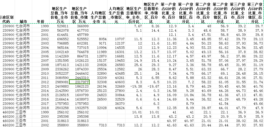 2、指标:行政区划代码、城市、年份、地区生产总值_当年价格_全市_万元、地区生产总值_当年价格_市辖区_万元、人均地区生产总值_全市_元、人均地区生产总值_市辖区_元、地区生产总值增长率_全市_百分比;