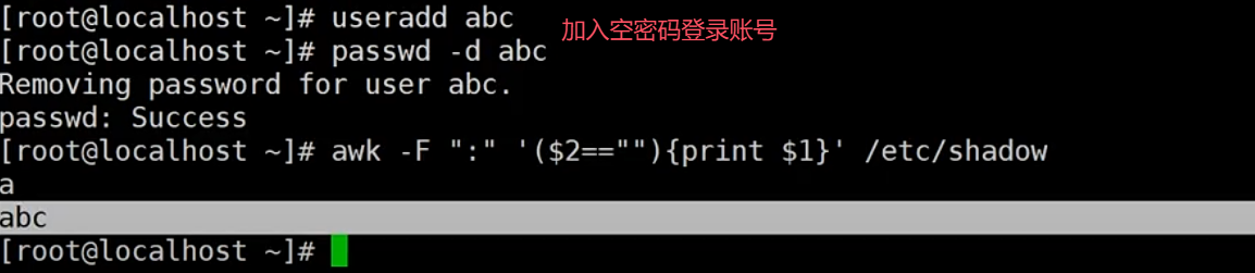 awk -F":"'($2==""){print $1}'/etc/shadow 查看是否存在空口令账号
