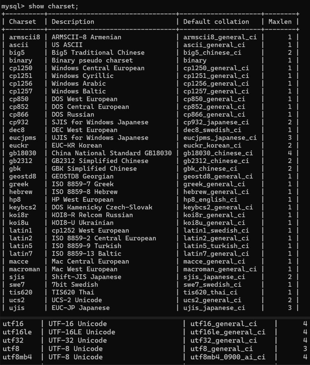 utf8mb4 编码是对 Unicode 字符集的⼀种实现,⽤1到4个字节表⽰⼀个字符,可以表⽰世界上