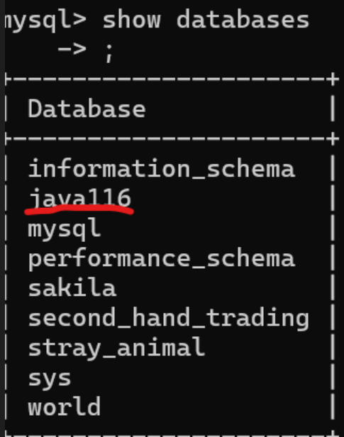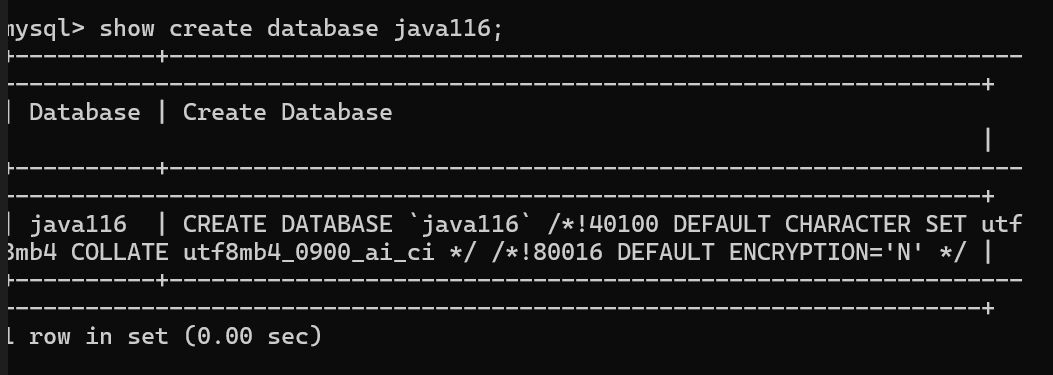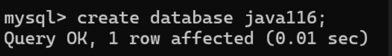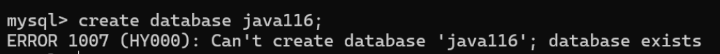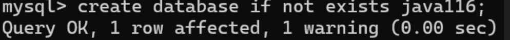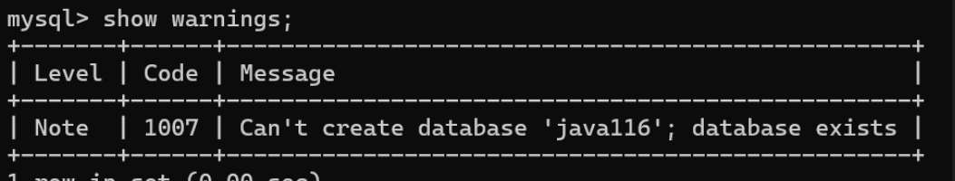 如果不存在java116库则创建,这个语句是对的,但是出现了一个警告信息 warning,然后我们来查看一下这个警告: