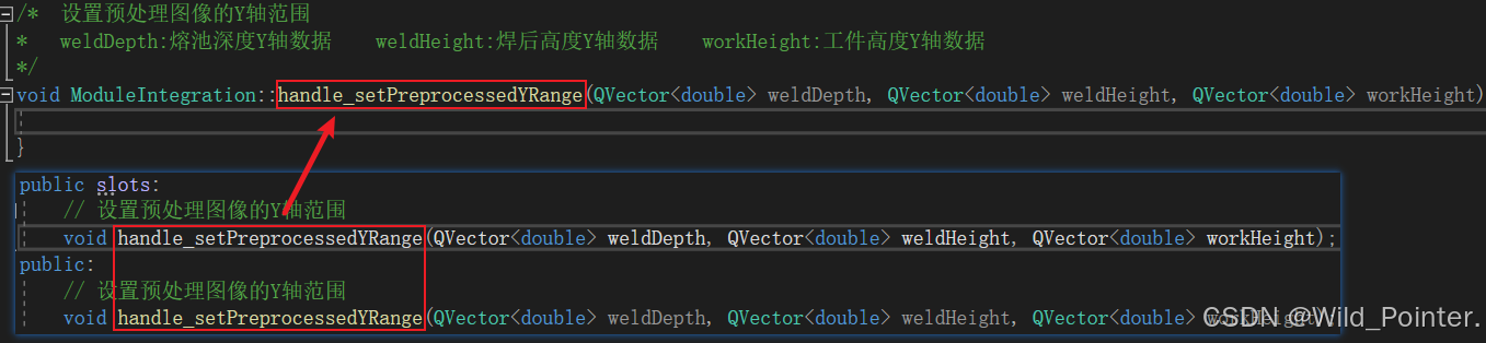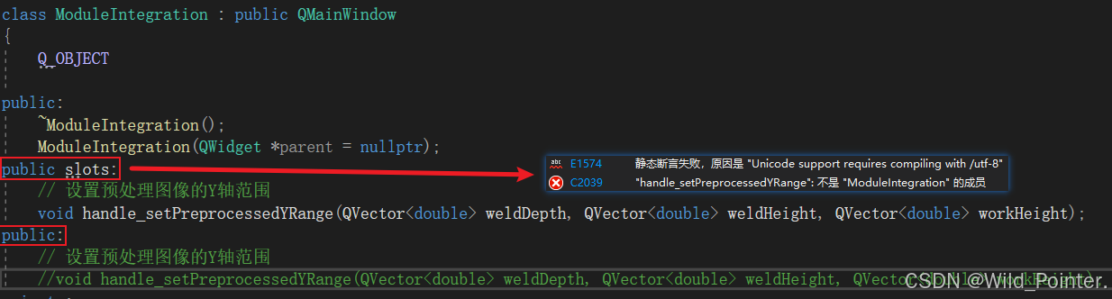 此时我怀疑是没有提供函数定义或者提供的函数定义参数有问题?于是跳转到了cpp文件检查了该槽函数的定义,并且保证函数定义和声明一致。但是在编译时还是提示该函数并不是ModuleIntegration类型的成员,这很奇怪,无论是参数,返回值还是函数命名都保持一致,为什么编译器还是找不到该槽函数?而我将该槽函数声明为普通函数时则不报错