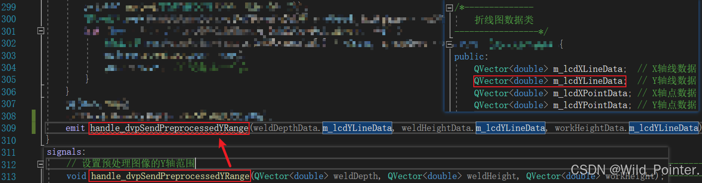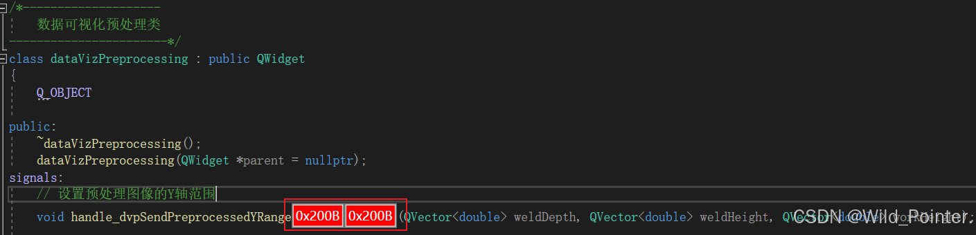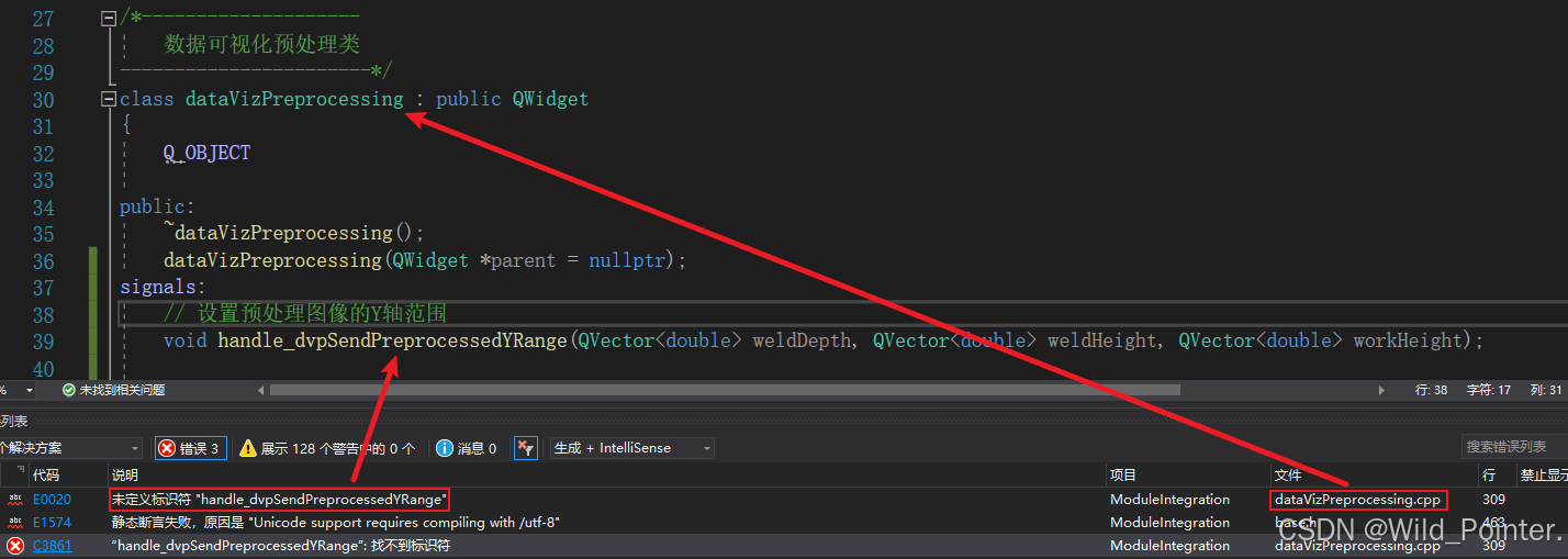除此之外,我在dataVizPreprocessing类型中定义了一个信号,该信号的参数为三个QVector<double>。但是当我使用connect()函数进行信号和槽的链接时提示该信号是未定义的标识符,这个报错首先令我想到的是信号的参数没有被Qt元对象识别?但是由于这三个参数都为QVector<double>类型,所以我果断排除了该原因。此外我还怀疑了是否是Qt5和Qt6的版本问题导致的信号槽链接出错,但是经过排查也否定了这个原因。