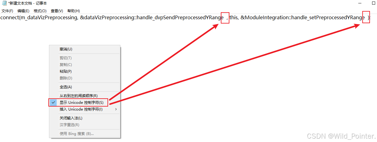 我们可以通过在记事本中右键,在点击显示Unicode控制字符后,则会见代码中隐藏的零宽空格0x200B显示出来