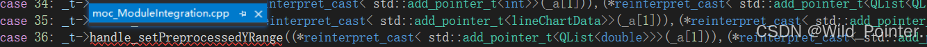 而我们在点击输出窗口中的列时,则会跳转到moc_ModuleIntegration.cpp文件中,该文件中已经将我们声明的槽函数进行链接,并且经过检查该函数的类型和信号类型完全一致。