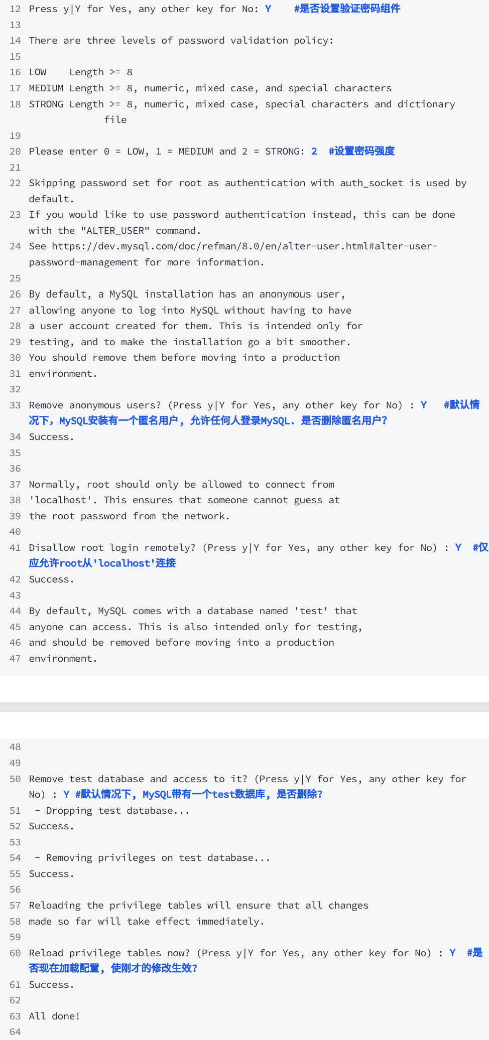 默认是 MySQL 设置是不安全的,MySQL 安装提供了一个安全脚本,用于解决不安全的默认选项