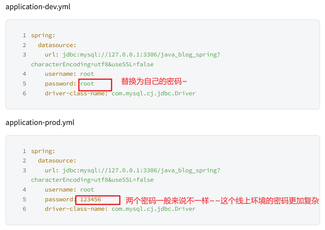最明显的一点就是 MySQL 数据库密码,我们在开发环境中的数据,都是 mock 的,一点不重要,被黑客窃取了也无所谓,可以设置简单密码 123456。但是开发环境中的 MySQL 密码,这可是关乎用户数据安全滴,一定要设置复杂密码~