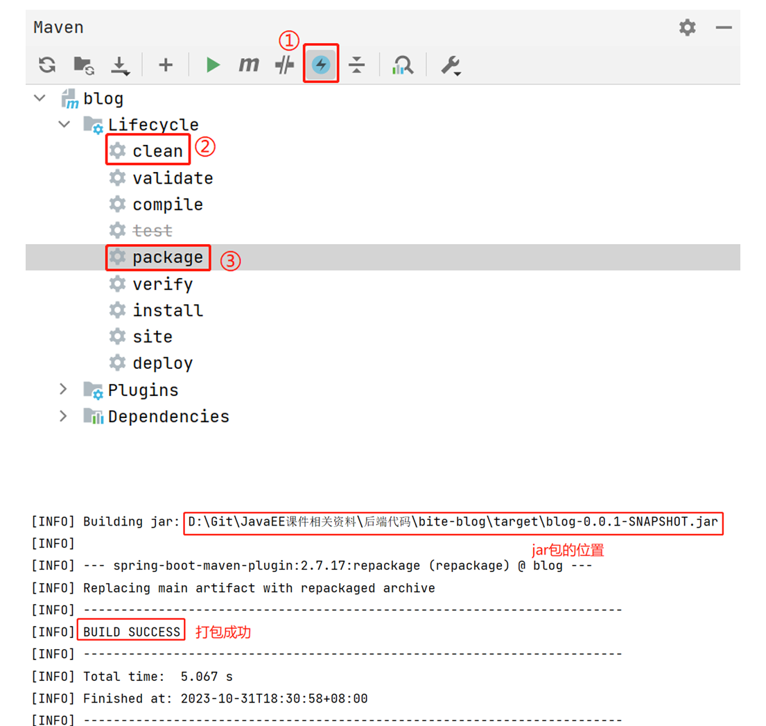 注意:如果 Test 代码中有与配置环境相关的操作(比如数据库的相关操作),打包会失败,可以点击下图中的图标,跳过测试