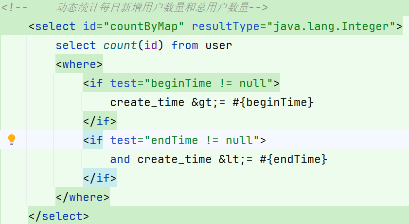 <!-- 动态统计每日新增用户数量和总用户数量--><select id="countByMap" resultType="java.lang.Integer">select count(id) from user<where><if test="beginTime != null">create_time >= #{beginTime}</if><if test="endTime != null">and create_time <= #{endTime}</if>