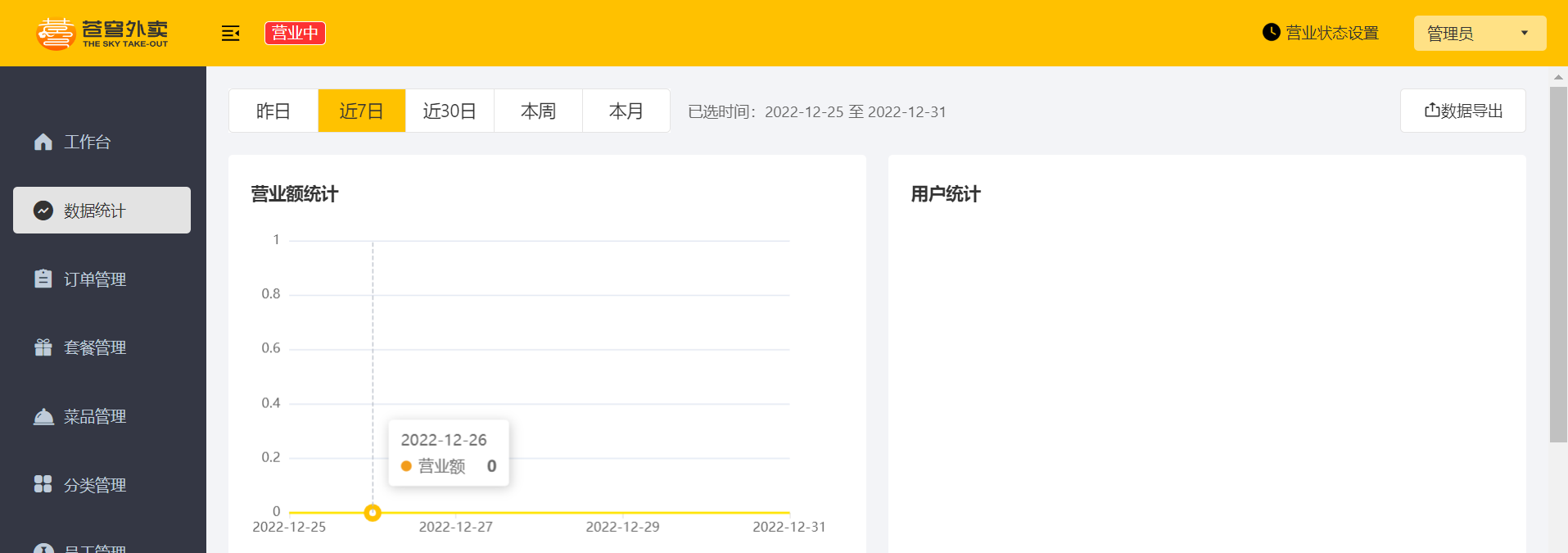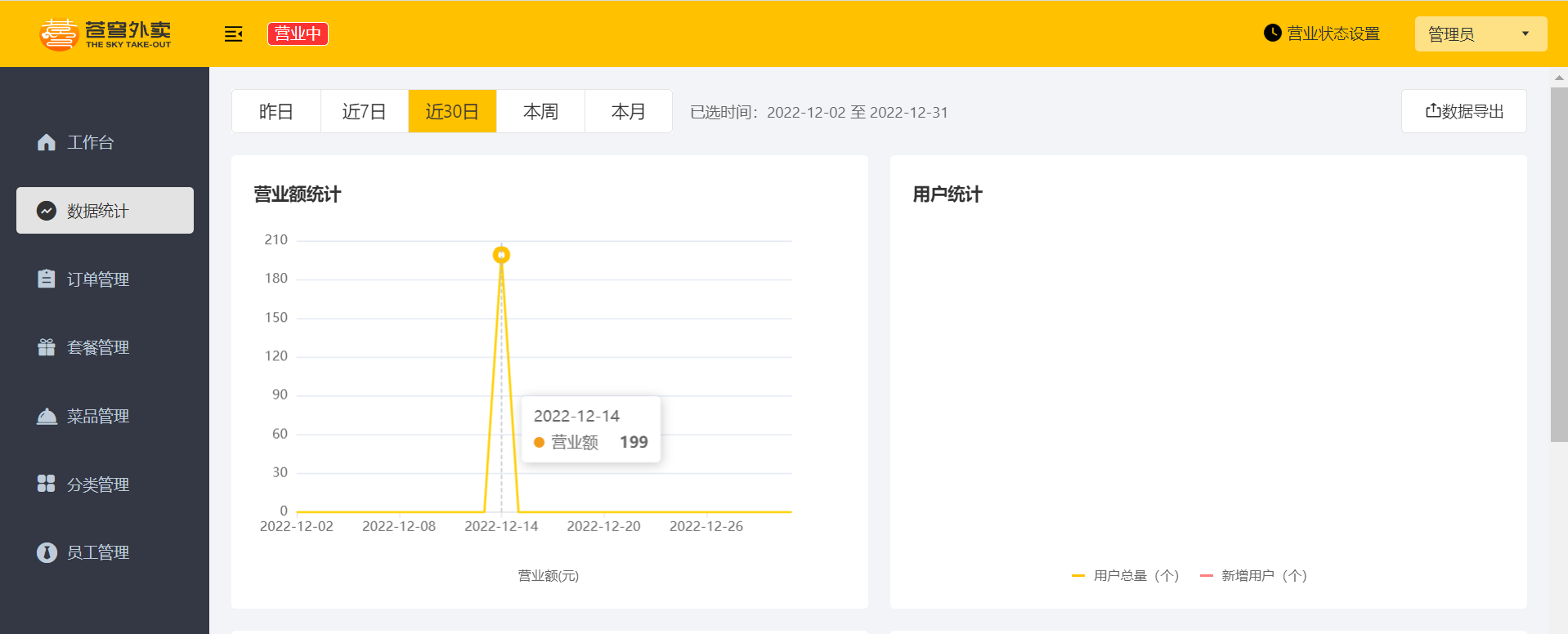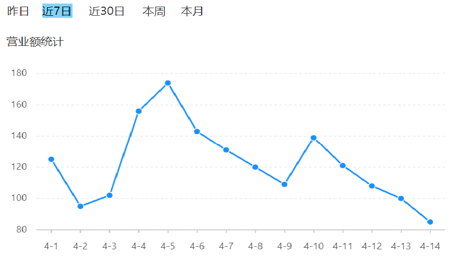 营业额统计是基于折线图来展现,并且按照天来展示的。实际上,就是某一个时间范围之内的每一天的营业额。同时,不管光标放在哪个点上,那么它就会把具体的数值展示出来。并且还需要注意日期并不是固定写死的,是由上边时间选择器来决定。比如选择是近7天、或者是近30日,或者是本周,就会把相应这个时间段之内的每一天日期通过横坐标展示。
