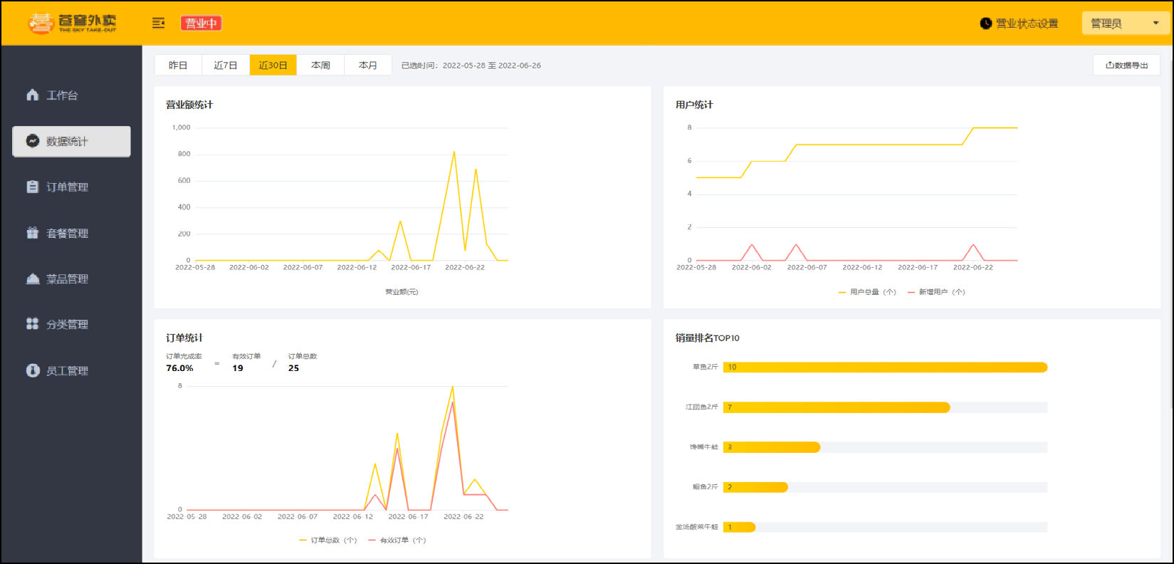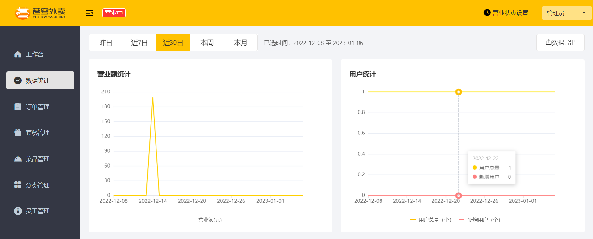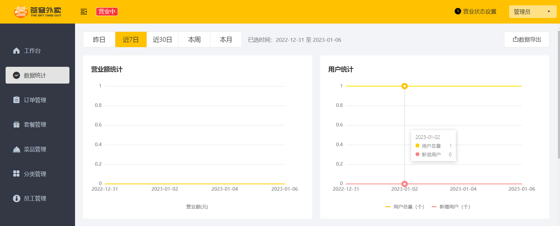 营业额统计是基于折线图来展现,并且按照天来展示的。实际上,就是某一个时间范围之内的每一天的营业额。同时,不管光标放在哪个点上,那么它就会把具体的数值展示出来。并且还需要注意日期并不是固定写死的,是由上边时间选择器来决定。比如选择是近7天、或者是近30日,或者是本周,就会把相应这个时间段之内的每一天日期通过横坐标展示。