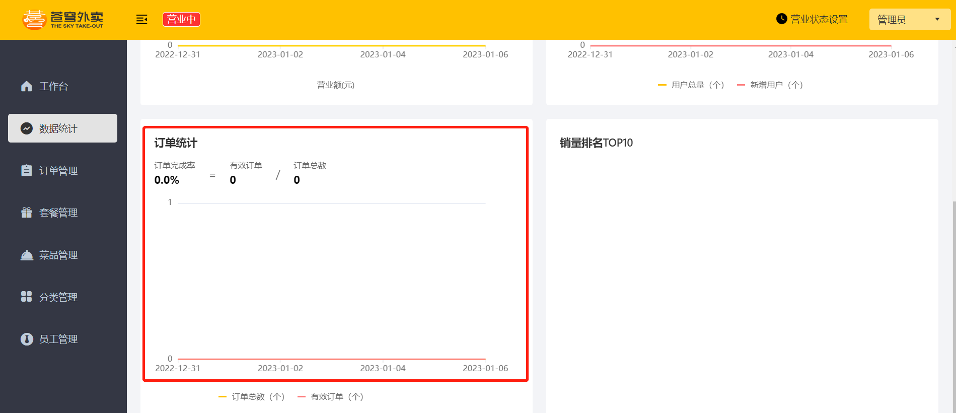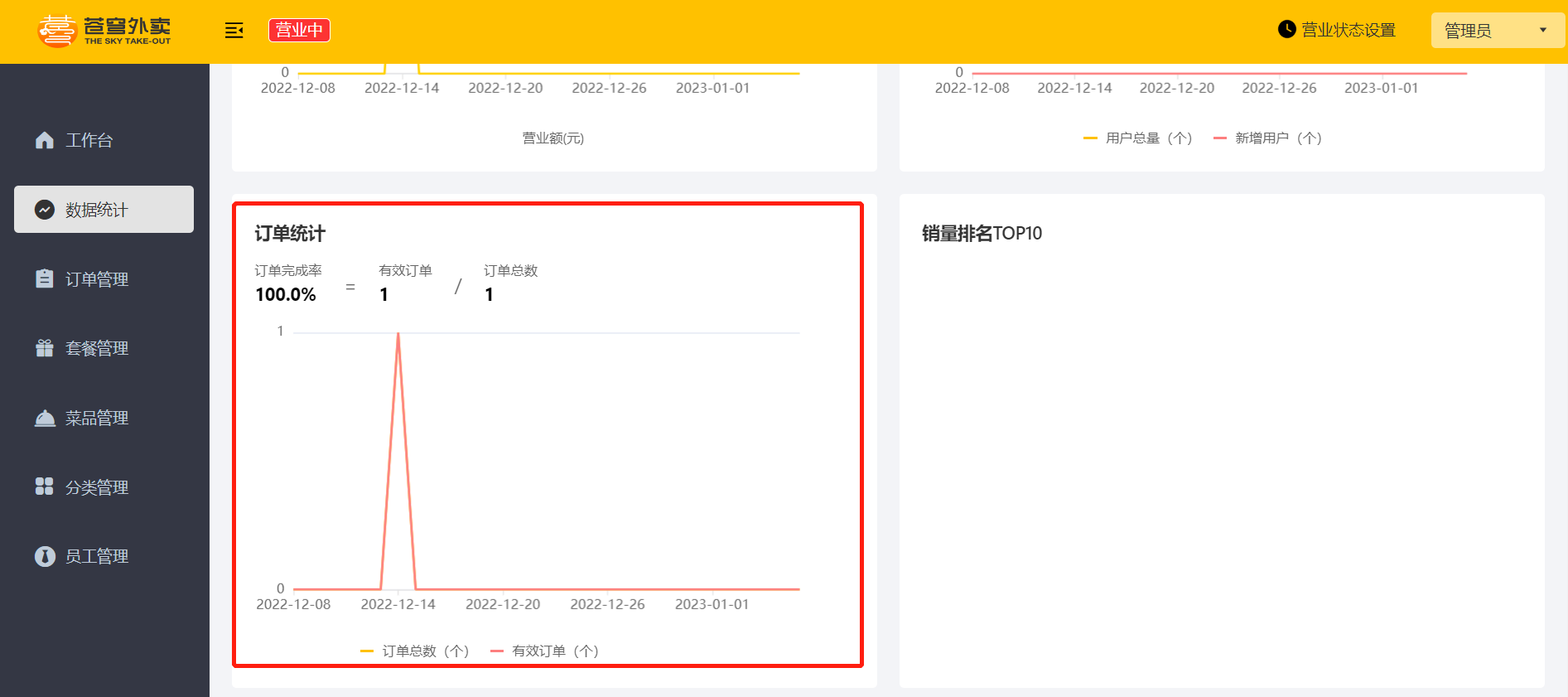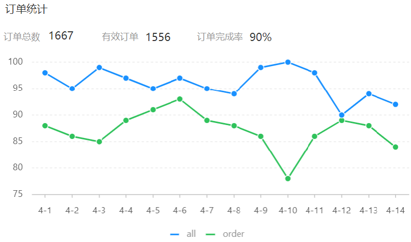 订单统计通过一个折现图来展现,折线图上有两根线,这根蓝色的线代表的是订单总数,而下边这根绿色的线代表的是有效订单数,指的就是状态是已完成的订单就属于有效订单,分别反映的是每一天的数据。上面还有3个数字,分别是订单总数、有效订单、订单完成率,它指的是整个时间区间之内总的数据。