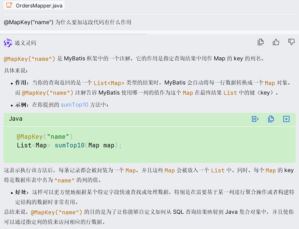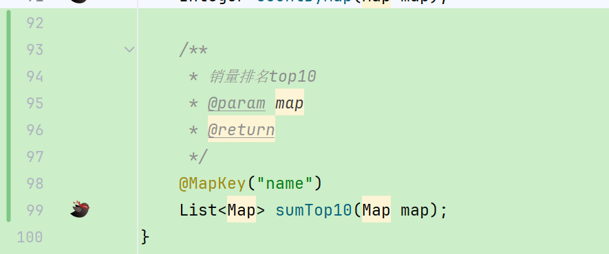 /*** 销量排名top10* @param map* @return*/@MapKey("name")List<GoodsSalesDTO> sumTop10(Map map);