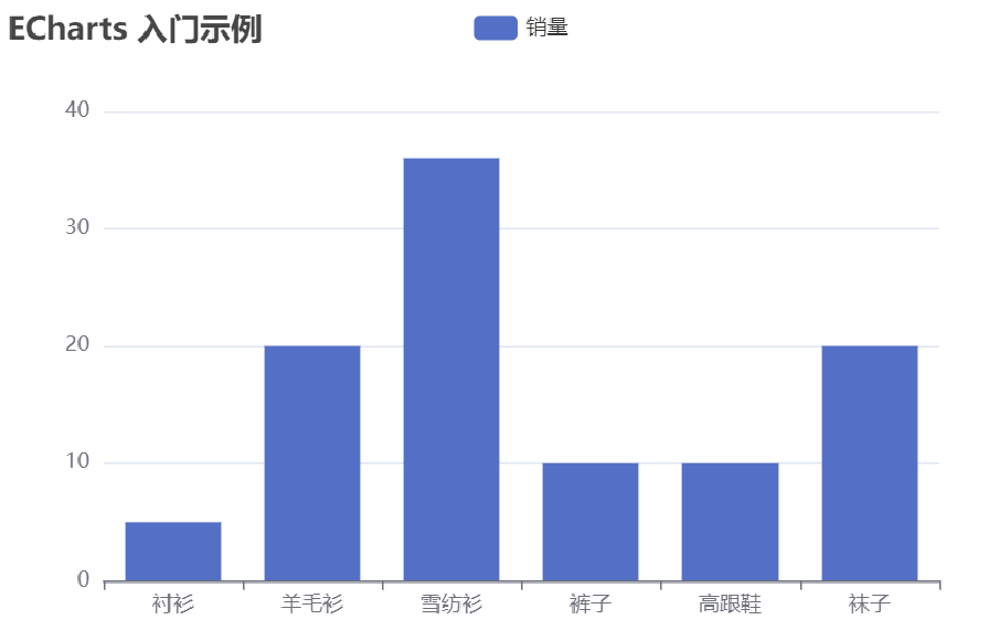<html><head><meta charset="utf-8" /><title>ECharts</title><!-- 引入刚刚下载的 ECharts 文件 --><script src="echarts.js"></script></head><body><!-- 为 ECharts 准备一个定义了宽高的 DOM --><div id="main" style="width: 600px;height:400px;"></div><script type="text/javascript">// 基于准备好的dom,初始化echarts实例var myChart = echarts.init(document.getElementById('main'));// 指定图表的配置项和数据var option = {title: {text: 'ECharts 入门示例'},tooltip: {},legend: {data: ['销量']},xAxis: {data: ['衬衫', '羊毛衫', '雪纺衫', '裤子', '高跟鞋', '袜子']},yAxis: {},series: [{name: '销量',type: 'bar',data: [5, 20, 36, 10, 10, 20]}]};// 使用刚指定的配置项和数据显示图表。myChart.setOption(option);</script></body>