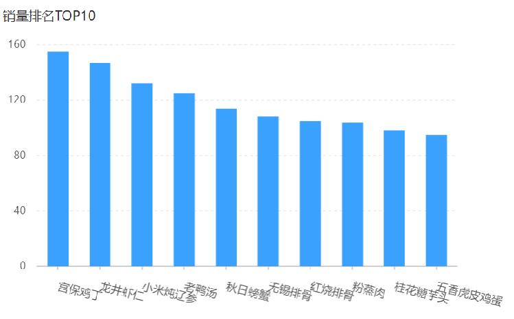 所谓销量排名,销量指的是商品销售的数量。项目当中的商品主要包含两类:一个是套餐,一个是菜品,所以销量排名其实指的就是菜品和套餐销售的数量排名。通过柱形图来展示销量排名,这些销量是按照降序来排列,并且只需要统计销量排名前十的商品。