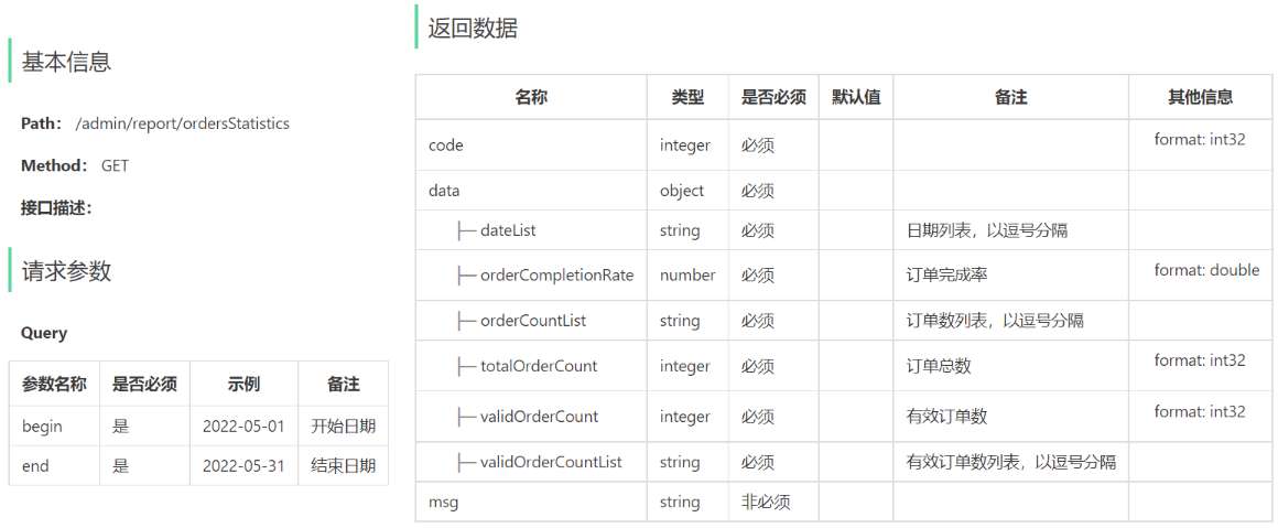 public class OrderReportVO implements Serializable {//日期,以逗号分隔,例如:2022-10-01,2022-10-02,2022-10-03private String dateList;//每日订单数,以逗号分隔,例如:260,210,215private String orderCountList;//每日有效订单数,以逗号分隔,例如:20,21,10private String validOrderCountList;//订单总数private Integer totalOrderCount;//有效订单数private Integer validOrderCount;//订单完成率private Double orderCompletionRate;}