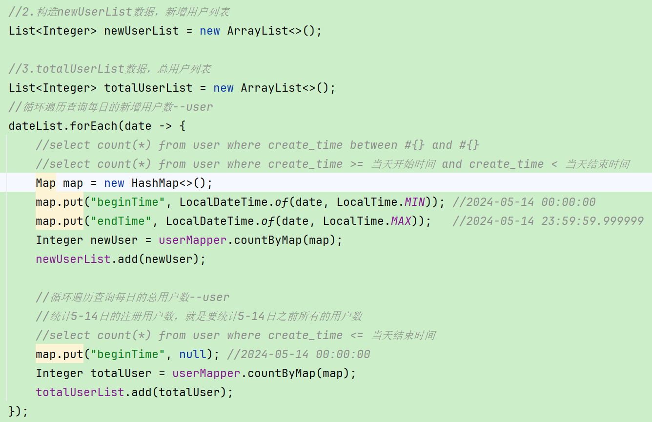 /*** 用户统计* @param begin* @param end* @return*/@Overridepublic UserReportVO userStaticstics(LocalDate begin, LocalDate end) {//1.构造dateList数据List<LocalDate> dateList = getDateList(begin, end);//2.构造newUserList数据,新增用户列表List<Integer> newUserList = new ArrayList<>();//3.totalUserList数据,总用户列表List<Integer> totalUserList = new ArrayList<>();//循环遍历查询每日的新增用户数--userdateList.forEach(date -> {//select count(*) from user where create_time between #{} and #{}//select count(*) from user where create_time >= 当天开始时间 and create_time < 当天结束时间Map map = new HashMap<>();map.put("beginTime", LocalDateTime.of(date, LocalTime.MIN)); //2024-05-14 00:00:00map.put("endTime", LocalDateTime.of(date, LocalTime.MAX)); //2024-05-14 23:59:59.999999Integer newUser = userMapper.countByMap(map);newUserList.add(newUser);//循环遍历查询每日的总用户数--user//统计5-14日的注册用户数,就是要统计5-14日之前所有的用户数//select count(*) from user where create_time <= 当天结束时间map.put("beginTime", null); //2024-05-14 00:00:00Integer totalUser = userMapper.countByMap(map);totalUserList.add(totalUser);});//4.构造UserReportVO对象并返回return UserReportVO.builder().dateList(StringUtils.join(dateList,",")).newUserList(StringUtils.join(newUserList,",")).totalUserList(StringUtils.join(totalUserList,",")).build();}/*** 获取指定日期范围内的日期列表数据* @param begin* @param end* @return*/private List<LocalDate> getDateList(LocalDate begin, LocalDate end){List<LocalDate> dateList = new ArrayList<LocalDate>();//循环插入日期数据while (!begin.isAfter(end)) {dateList.add(begin);begin = begin.plusDays(1);}log.info("dateList = {}" , dateList);return dateList;}