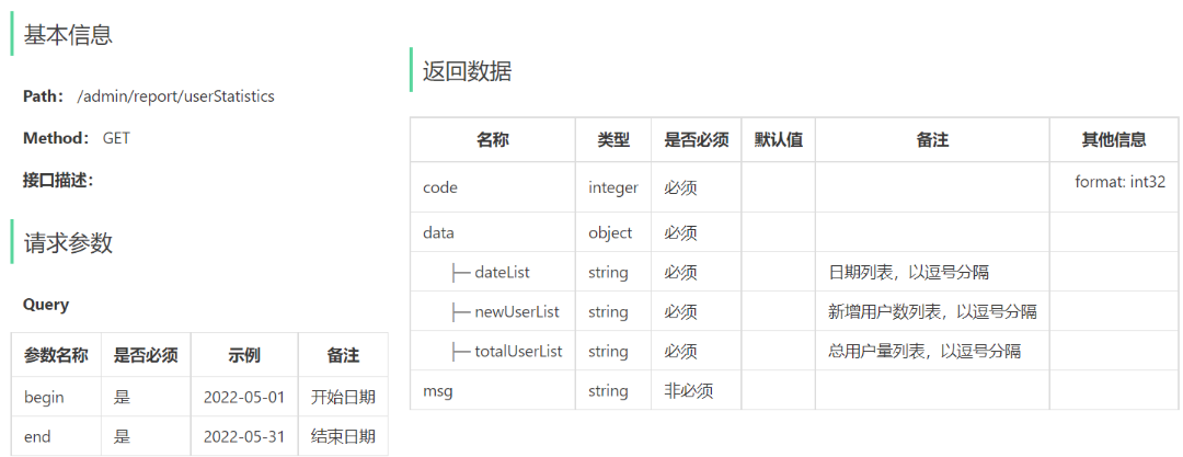 /*** 用户统计* @param begin* @param end* @return*/UserReportVO userStaticstics(LocalDate begin, LocalDate end);