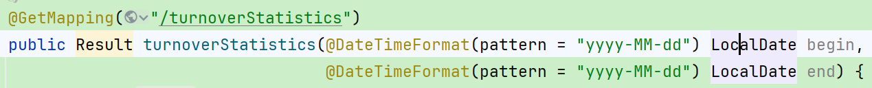 @ApiOperation("用户统计")@GetMapping("/userStatistics")public Result<UserReportVO> userStatistics(@DateTimeFormat(pattern = "yyyy-MM-dd") LocalDate begin,@DateTimeFormat(pattern = "yyyy-MM-dd") LocalDate end) {log.info("用户统计:{},{}",begin,end);UserReportVO vo = reportService.userStaticstics(begin,end);return Result.success(vo);}