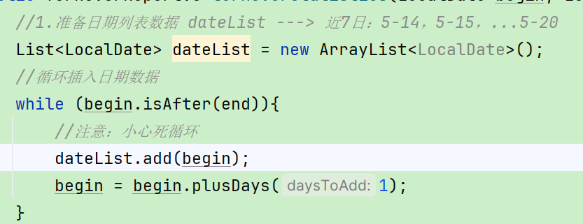 /*** 获取指定日期范围内的日期列表数据* @param begin* @param end* @return*/private List<LocalDate> getDateList(LocalDate begin, LocalDate end){List<LocalDate> dateList = new ArrayList<LocalDate>();//循环插入日期数据while (!begin.isAfter(end)) {dateList.add(begin);begin = begin.plusDays(1);}log.info("dateList = {}" , dateList);return dateList;}