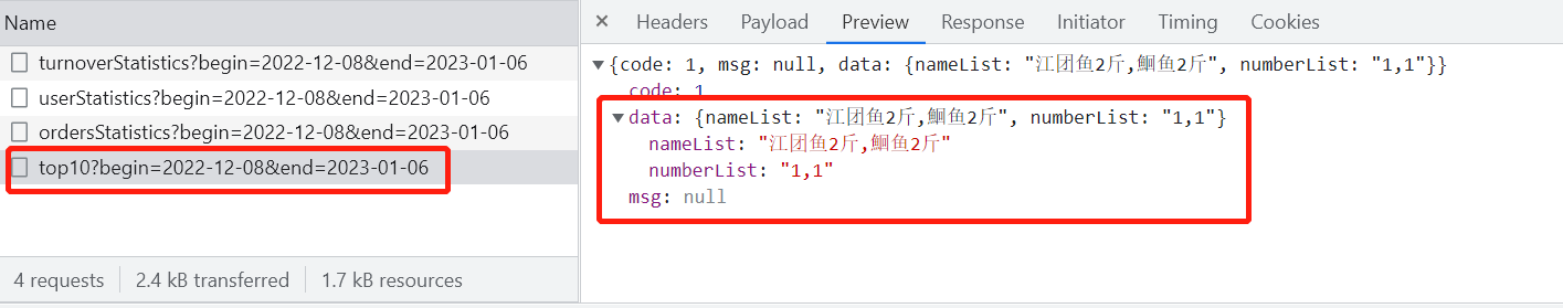 public class SalesTop10ReportVO implements Serializable {//商品名称列表,以逗号分隔,例如:鱼香肉丝,宫保鸡丁,水煮鱼private String nameList;//销量列表,以逗号分隔,例如:260,215,200private String numberList;}