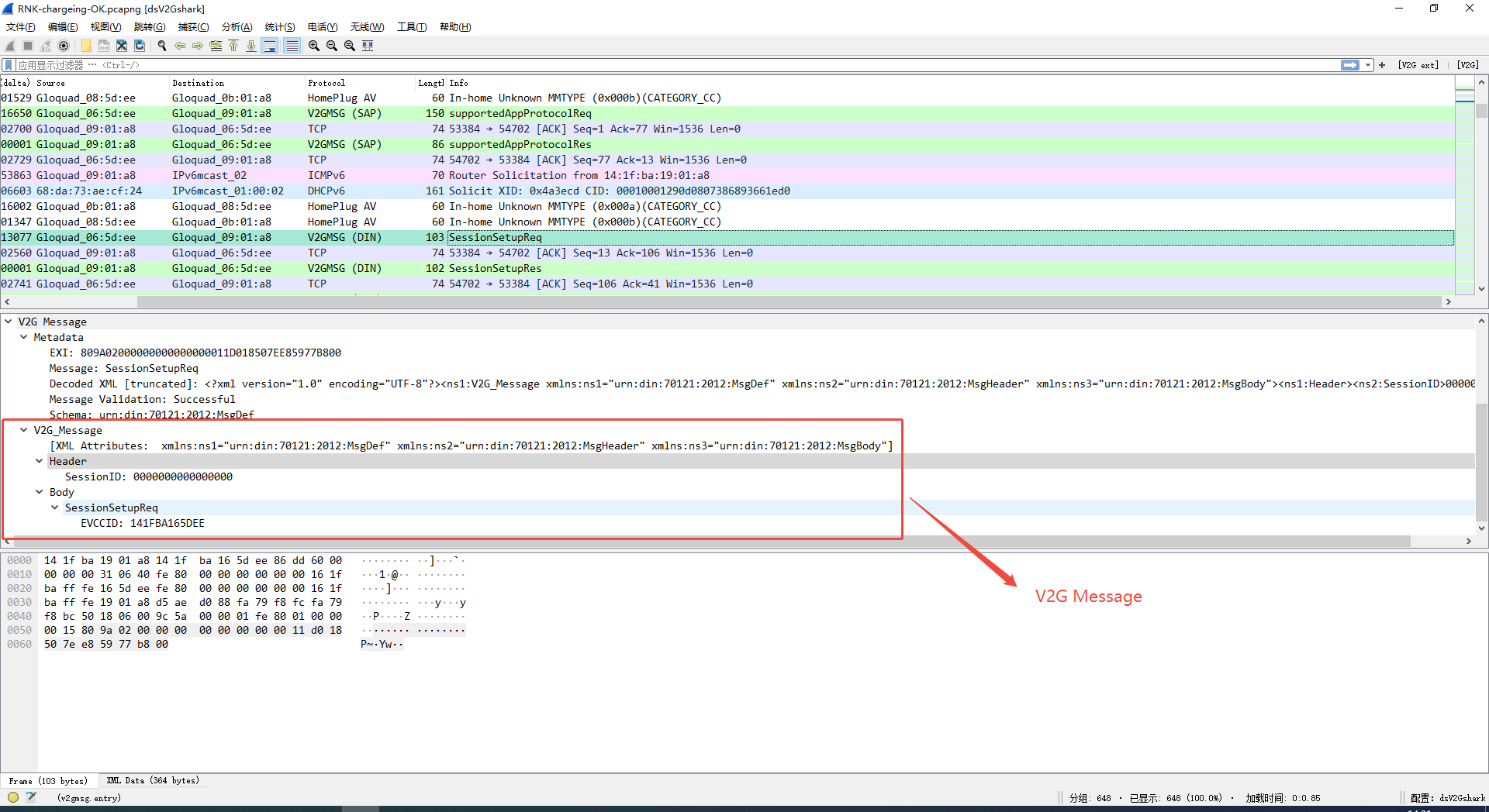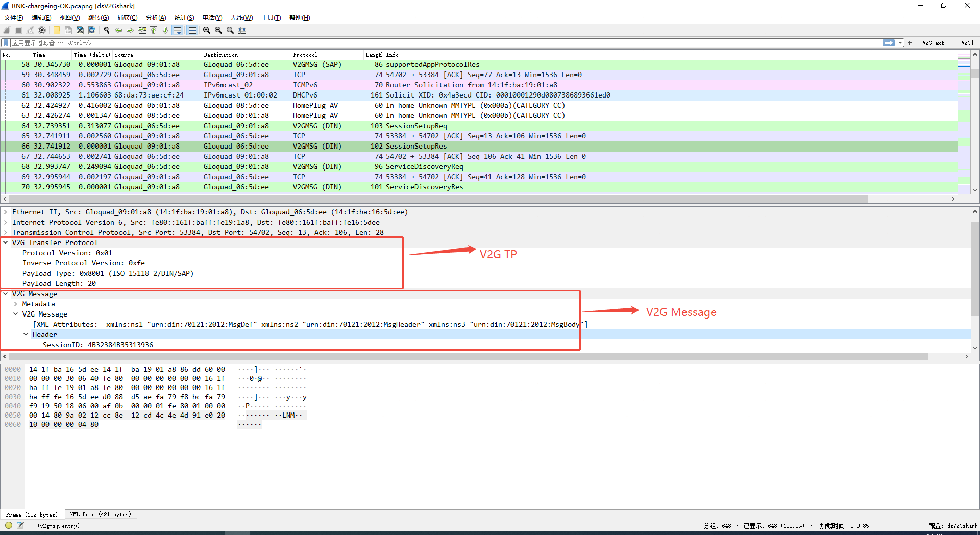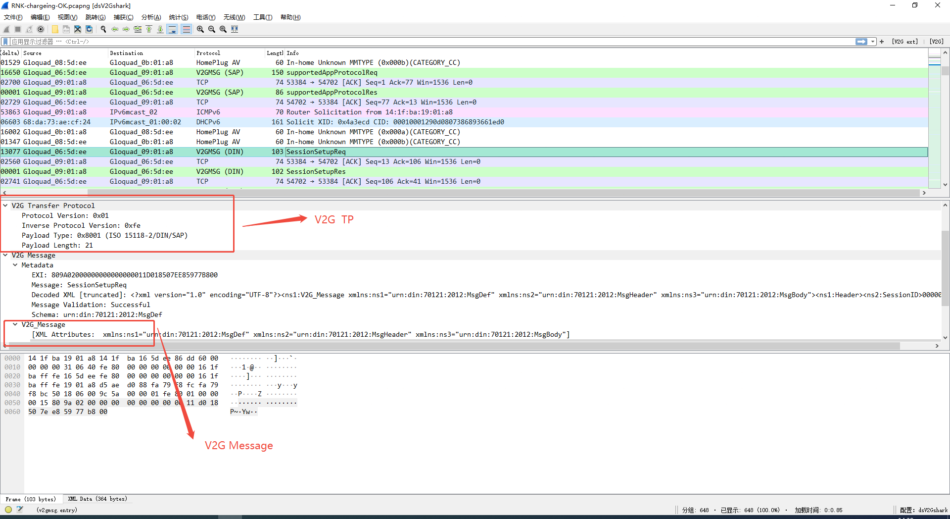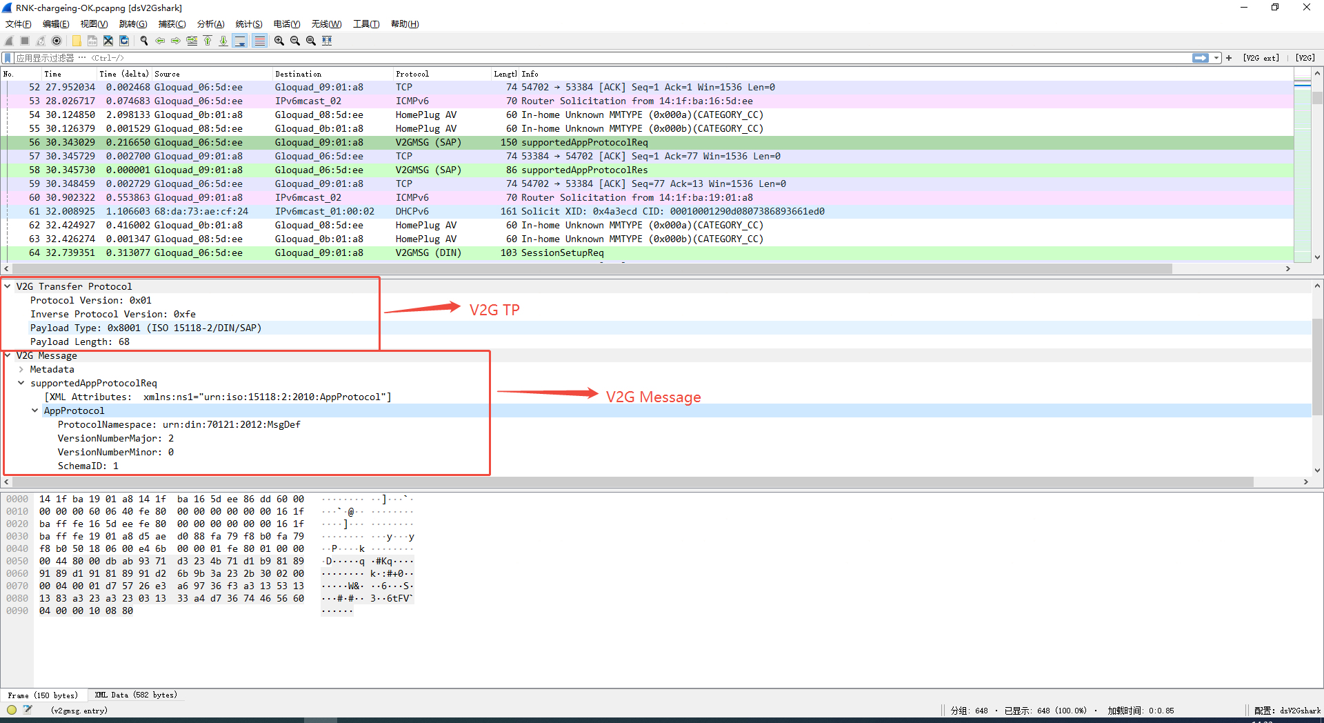 如下图所示,V2G TP是HEX,V2G Message XML 格式并 EXI 封装后的HEX