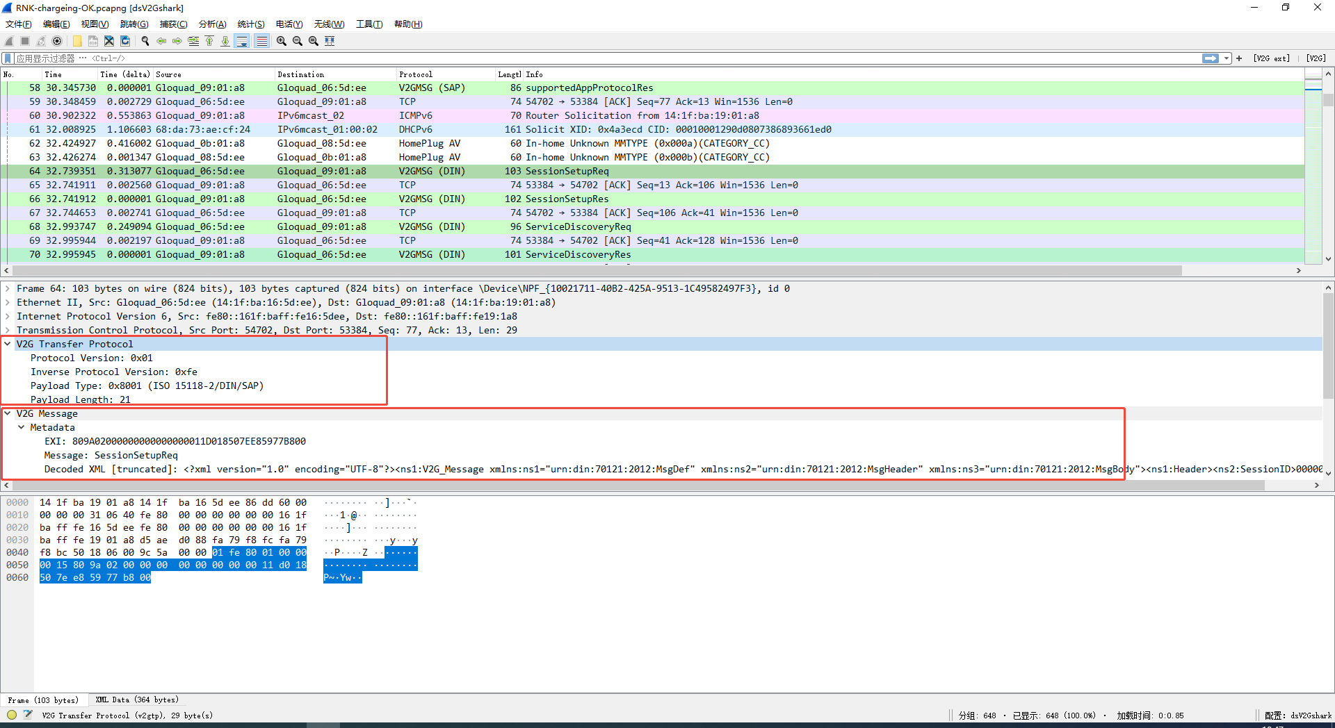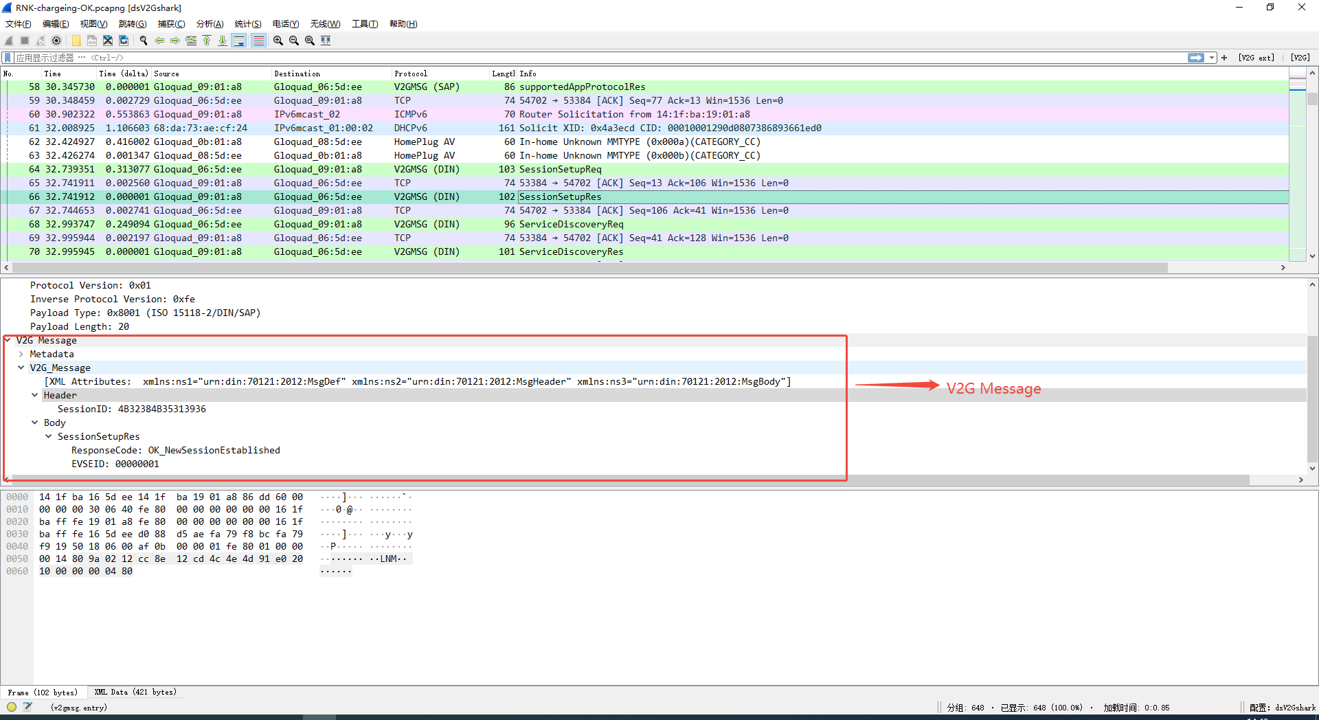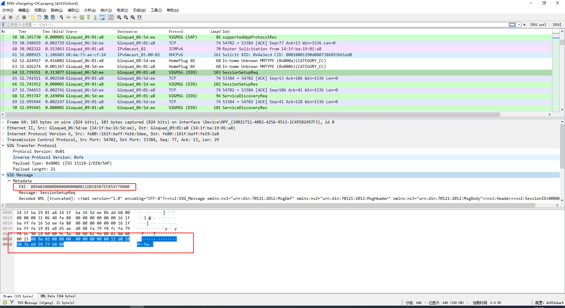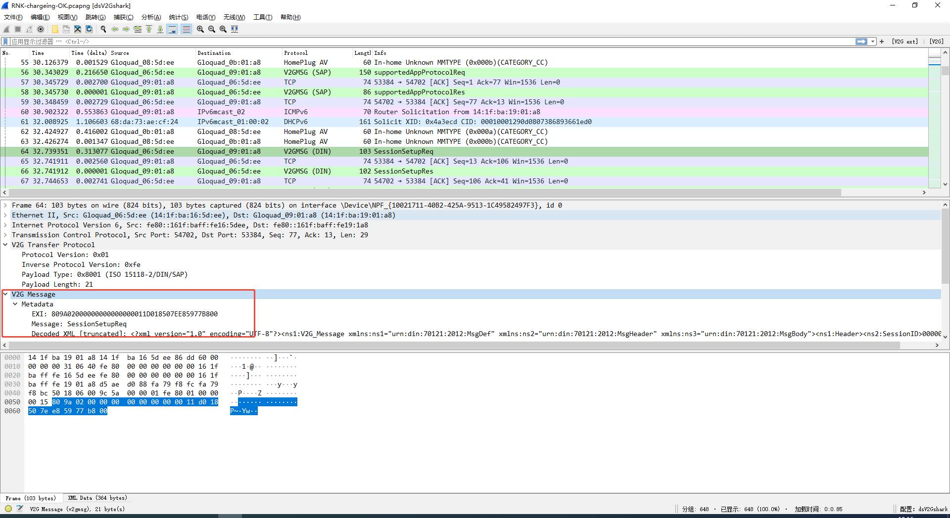 如下图所示,V2G TP是HEX,V2G Message XML 格式并 EXI 封装后的HEX