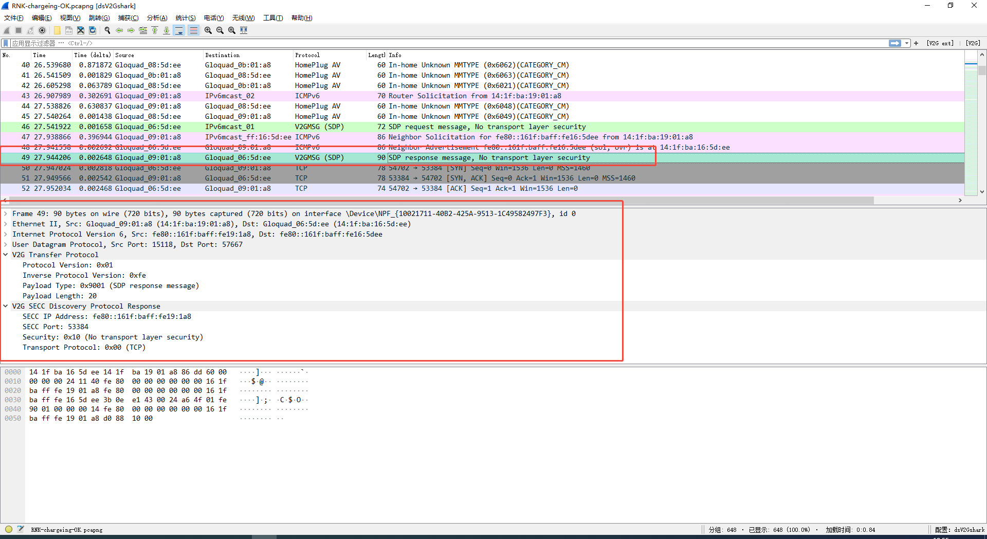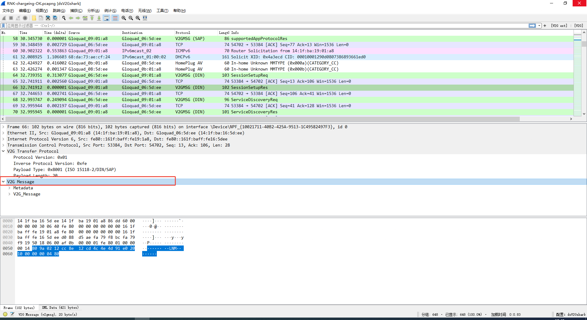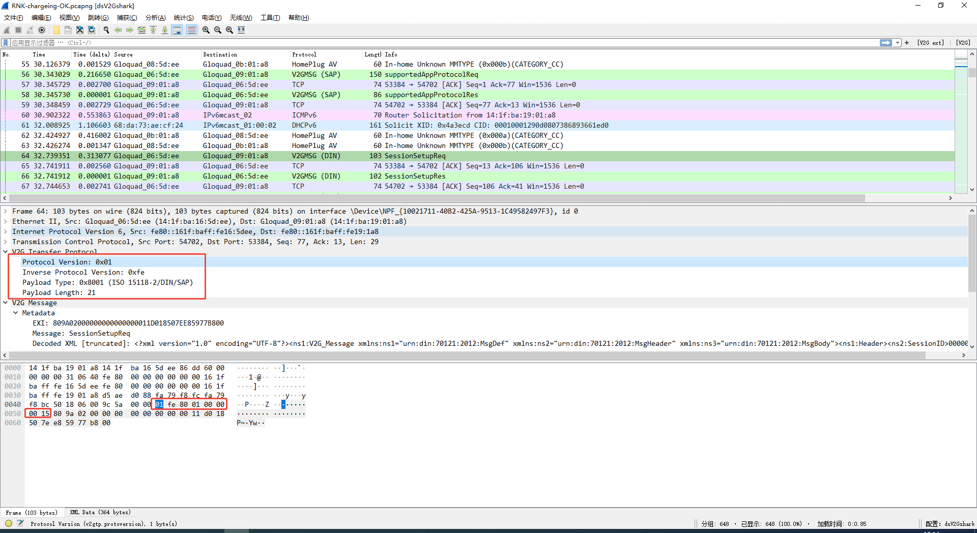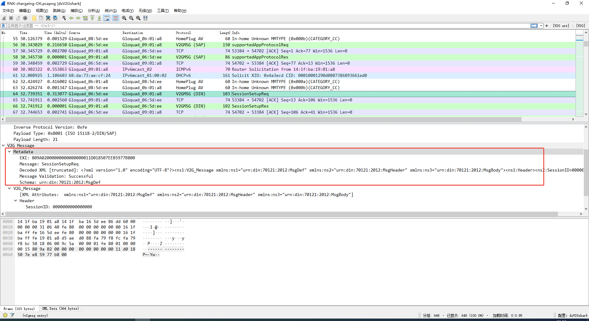 如下图所示,V2G TP是HEX,V2G Message XML 格式并 EXI 封装后的HEX