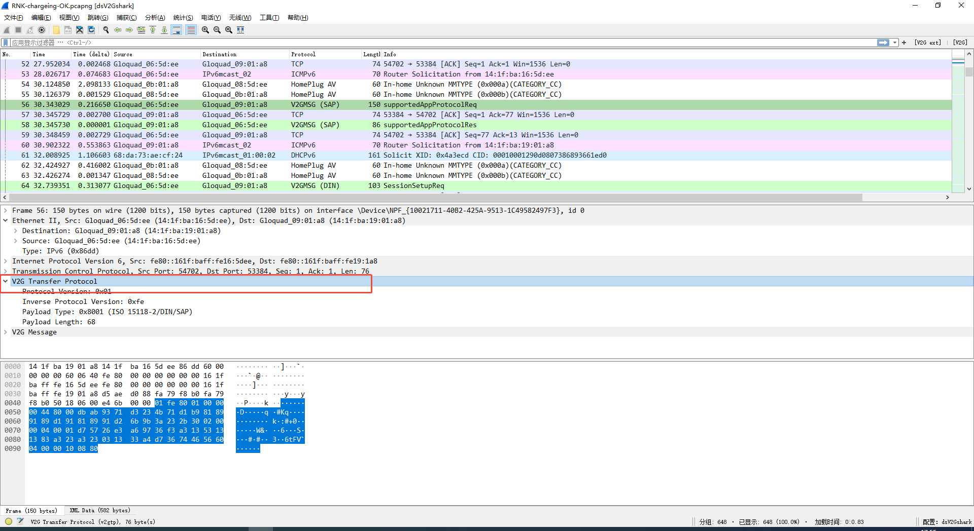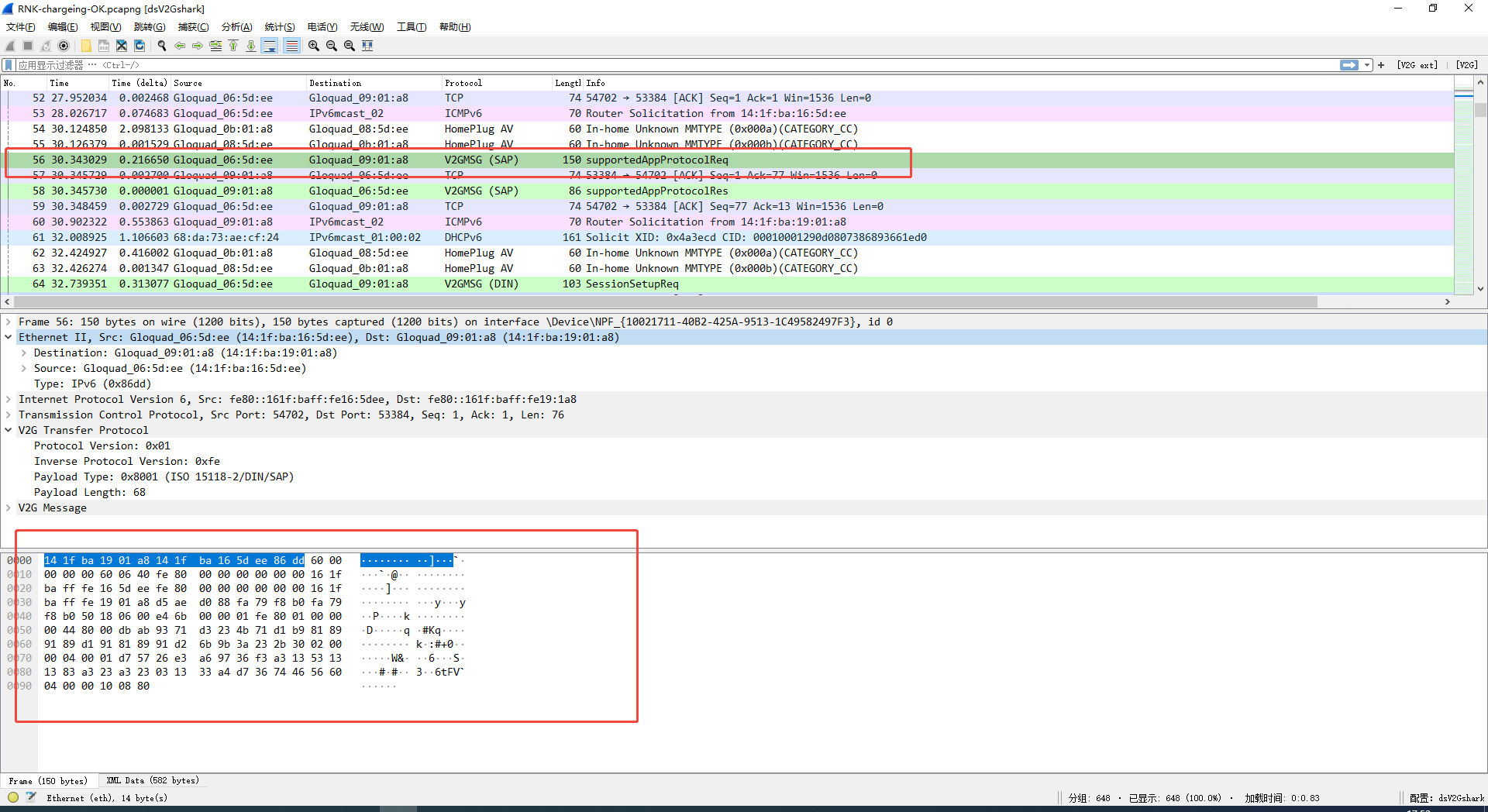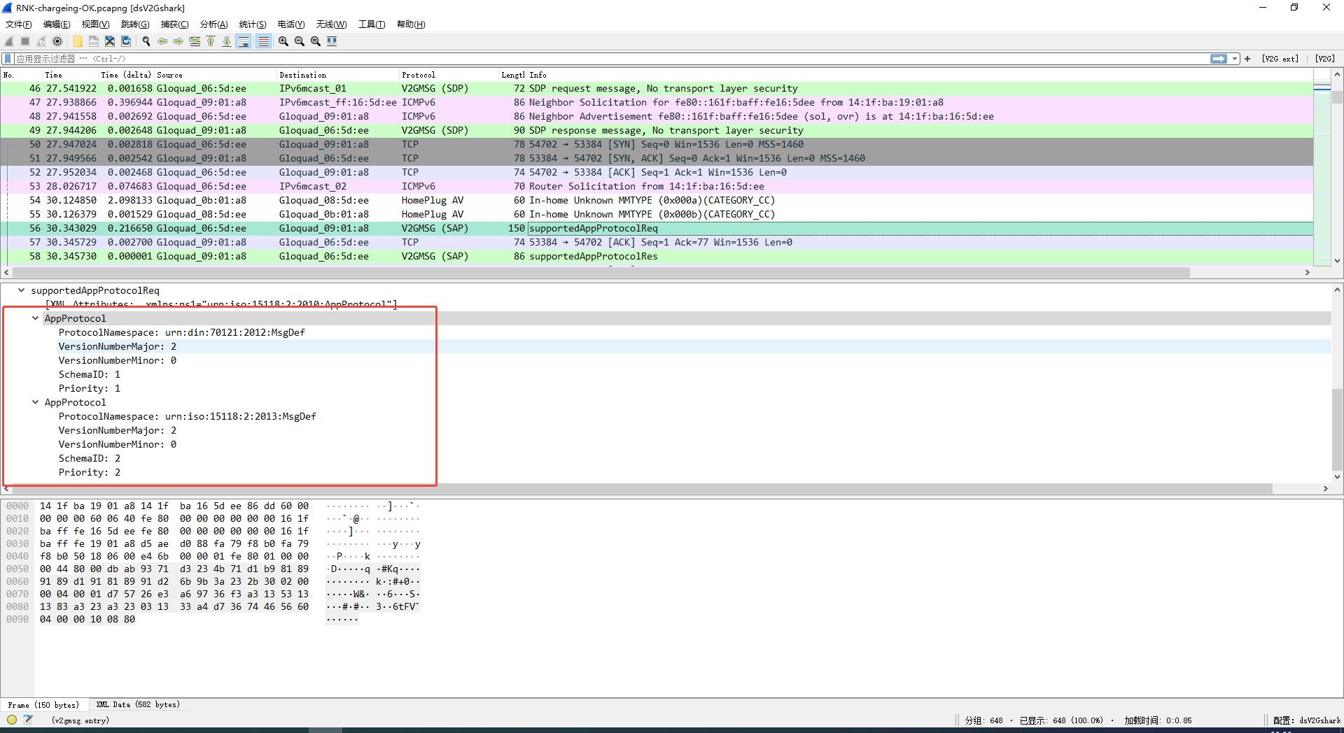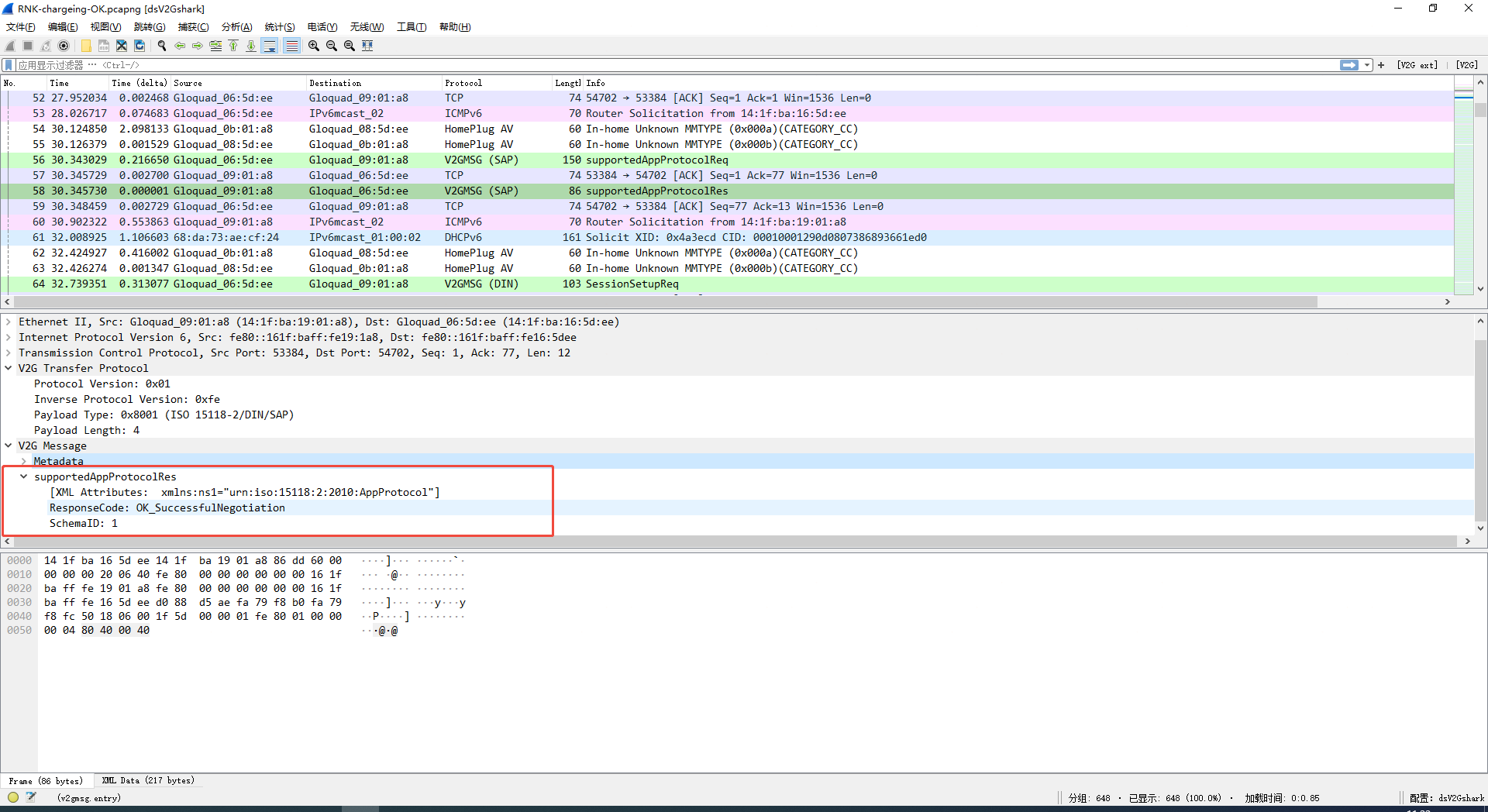 如下图,可以清晰看到 supportedAppProtocolReq帧是基于以太网帧、IPV6、TCP、V2G的嵌套结构