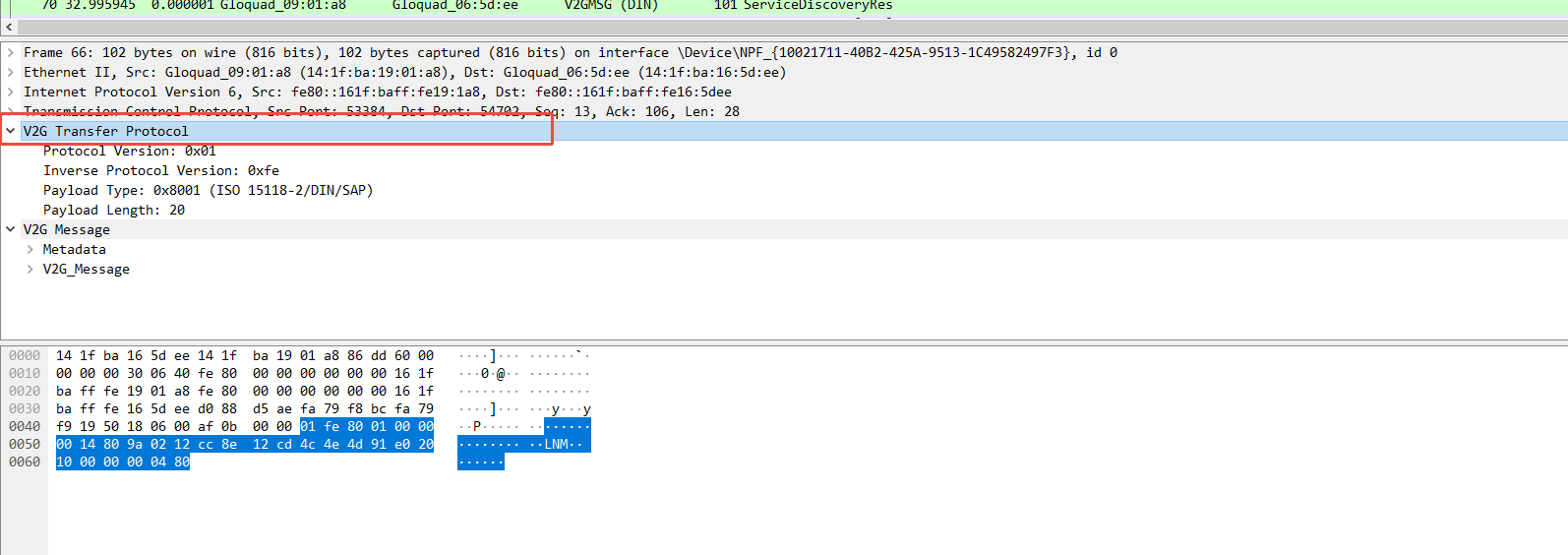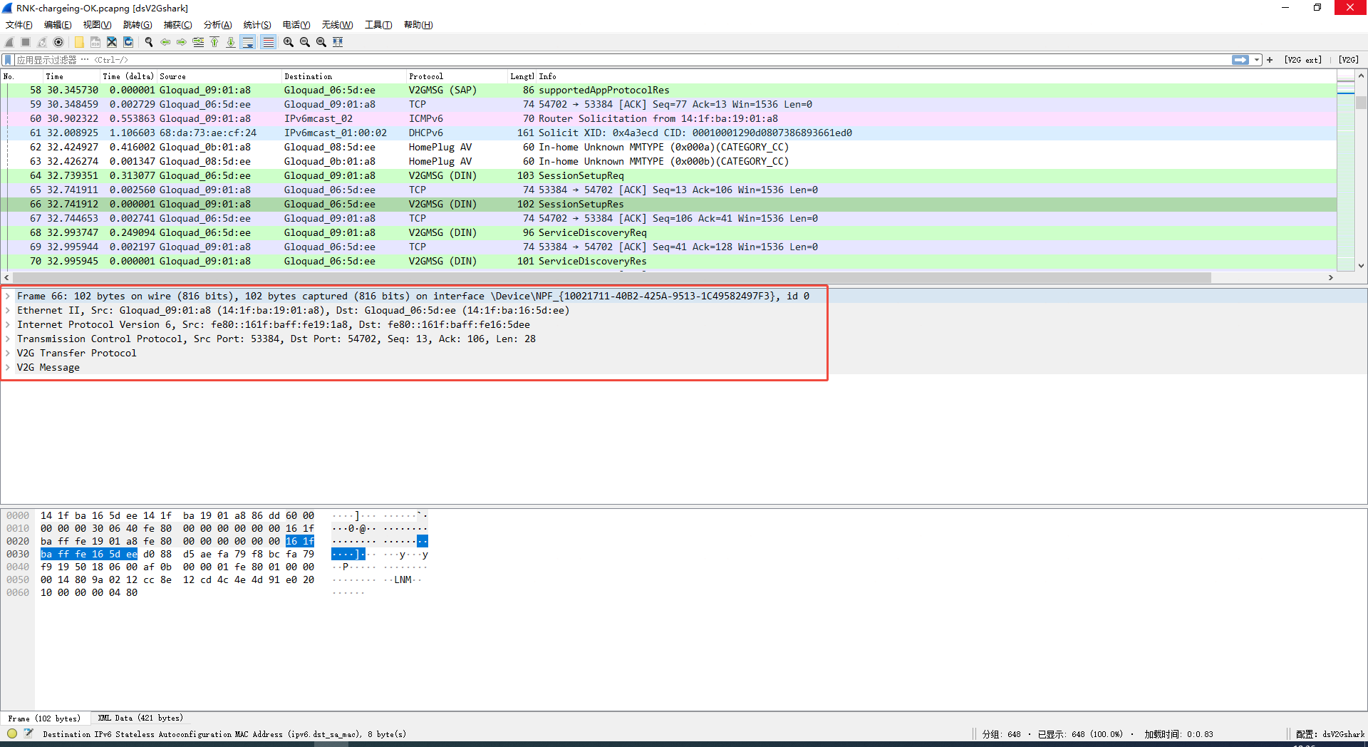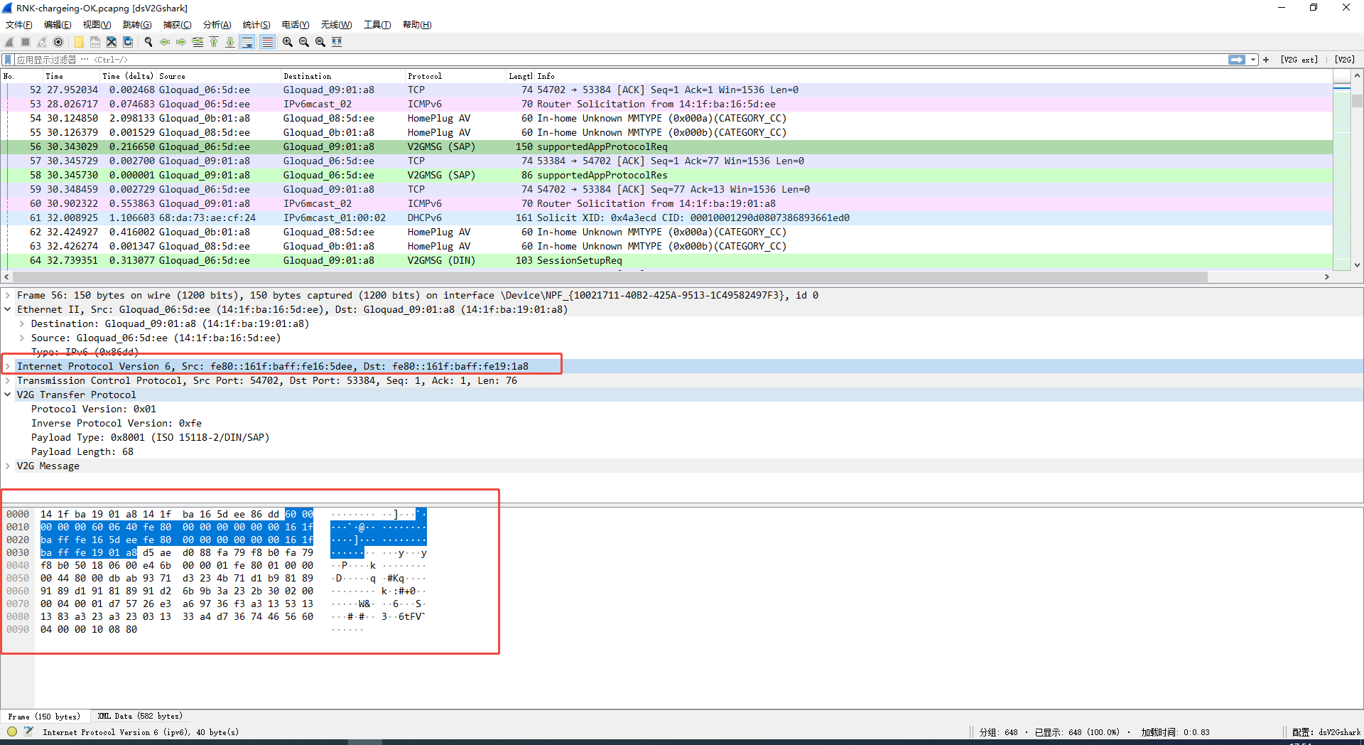 如下图,可以清晰看到 supportedAppProtocolReq帧是基于以太网帧、IPV6、TCP、V2G的嵌套结构