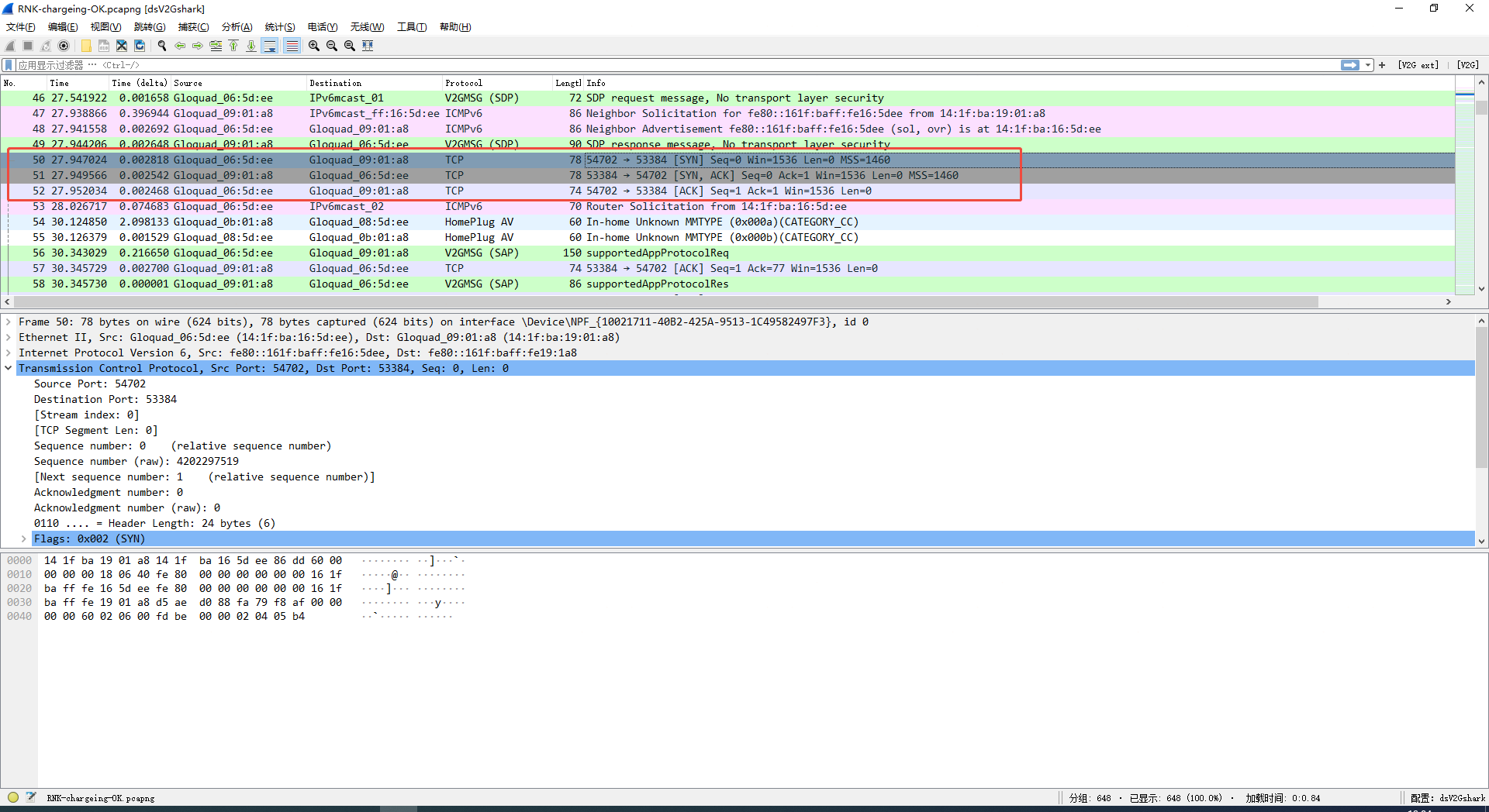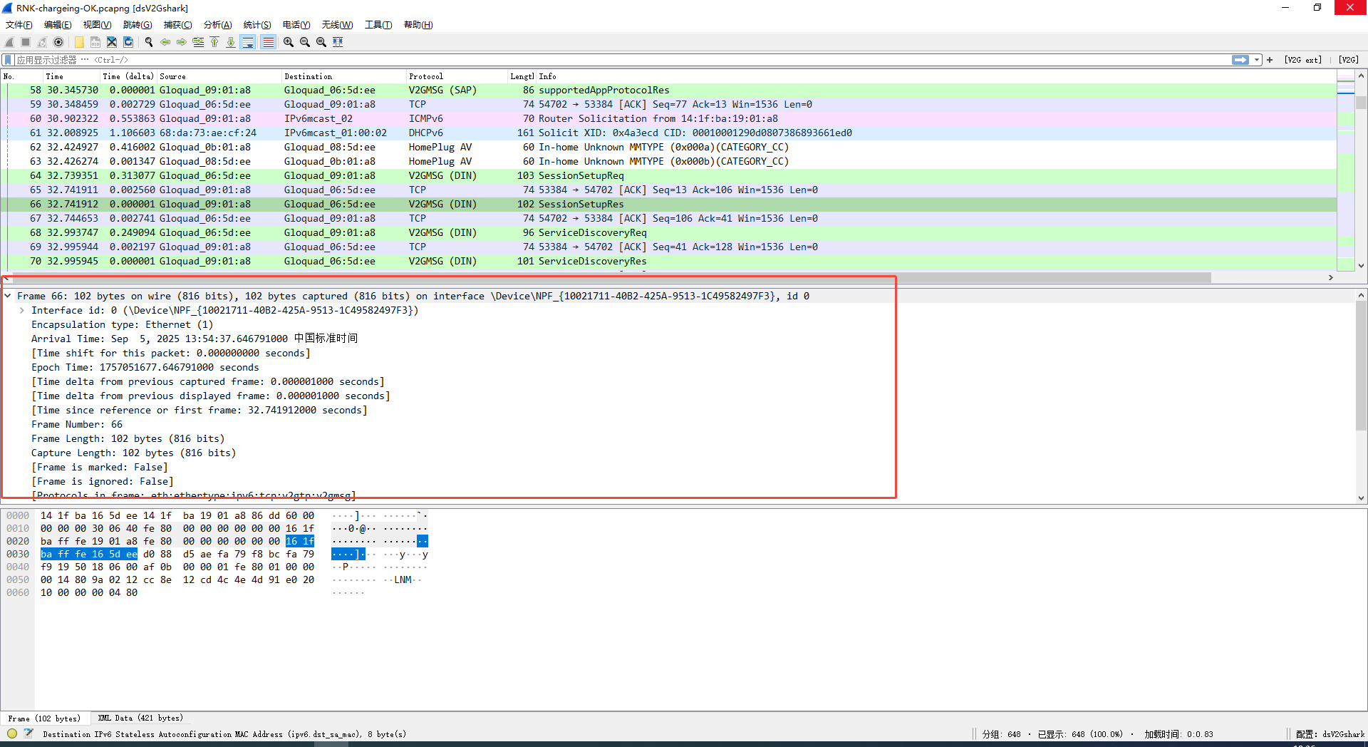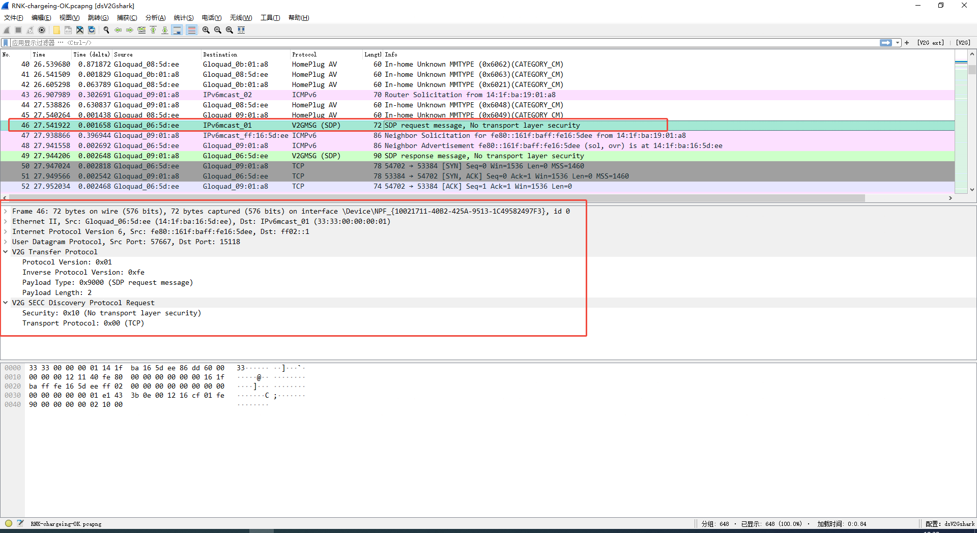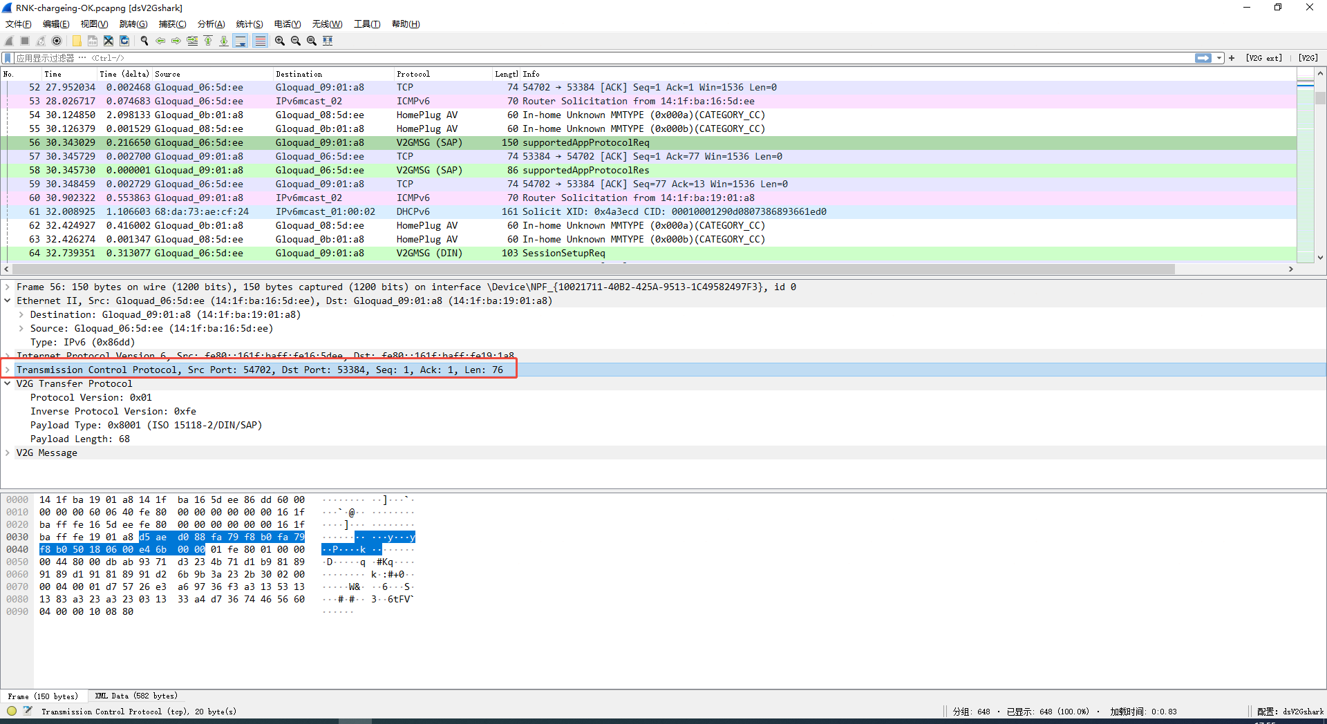 如下图,可以清晰看到 supportedAppProtocolReq帧是基于以太网帧、IPV6、TCP、V2G的嵌套结构