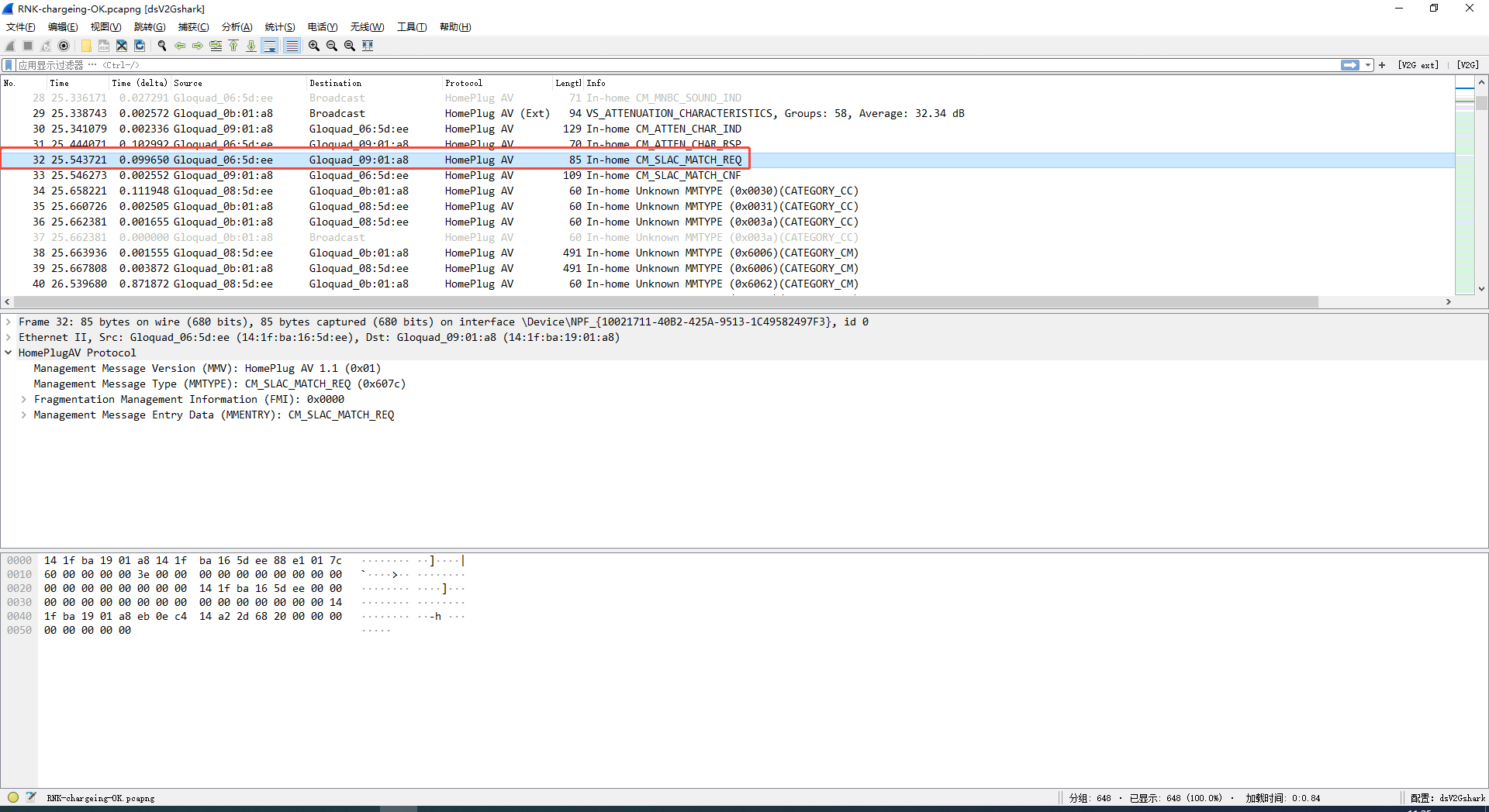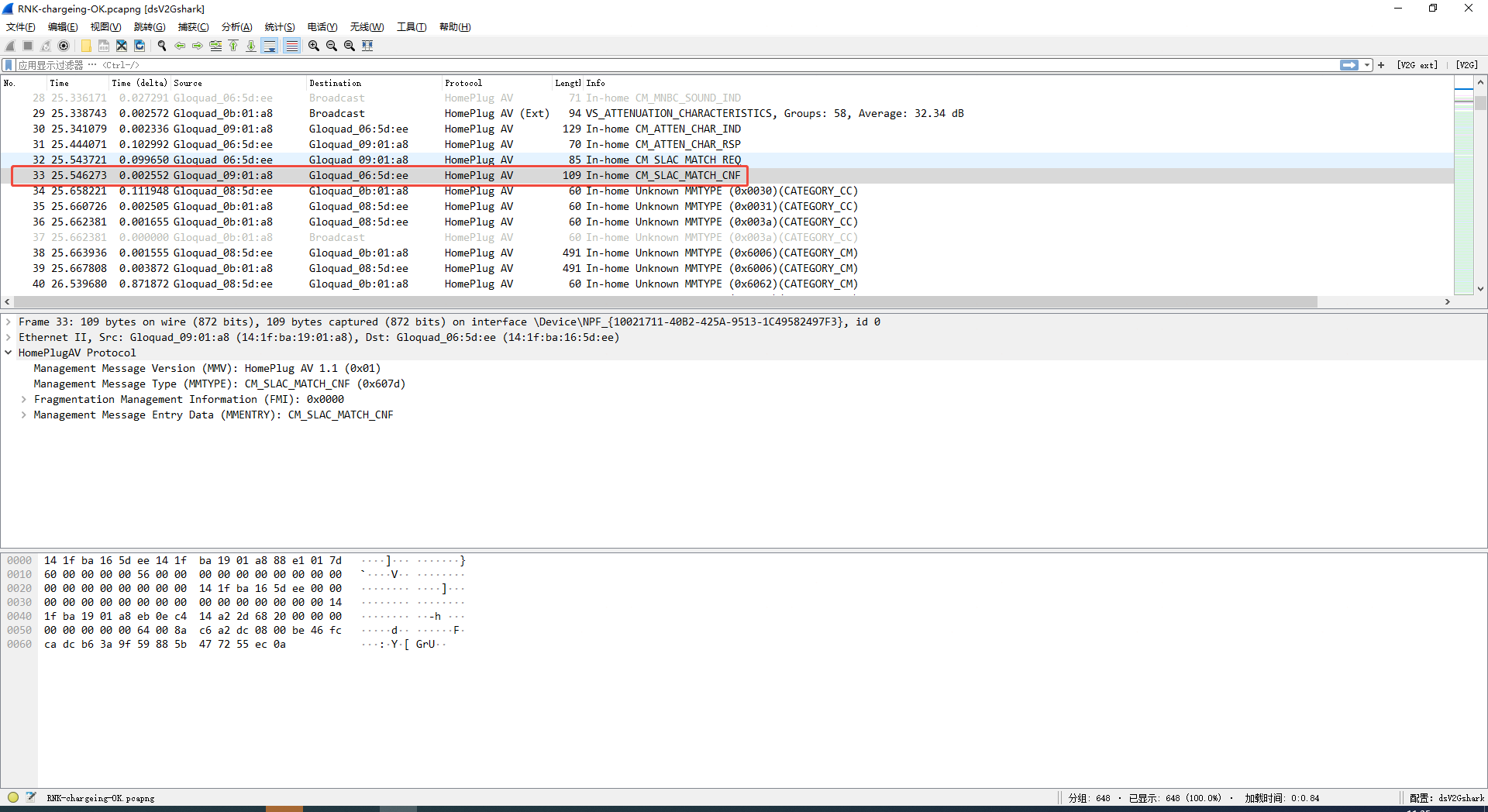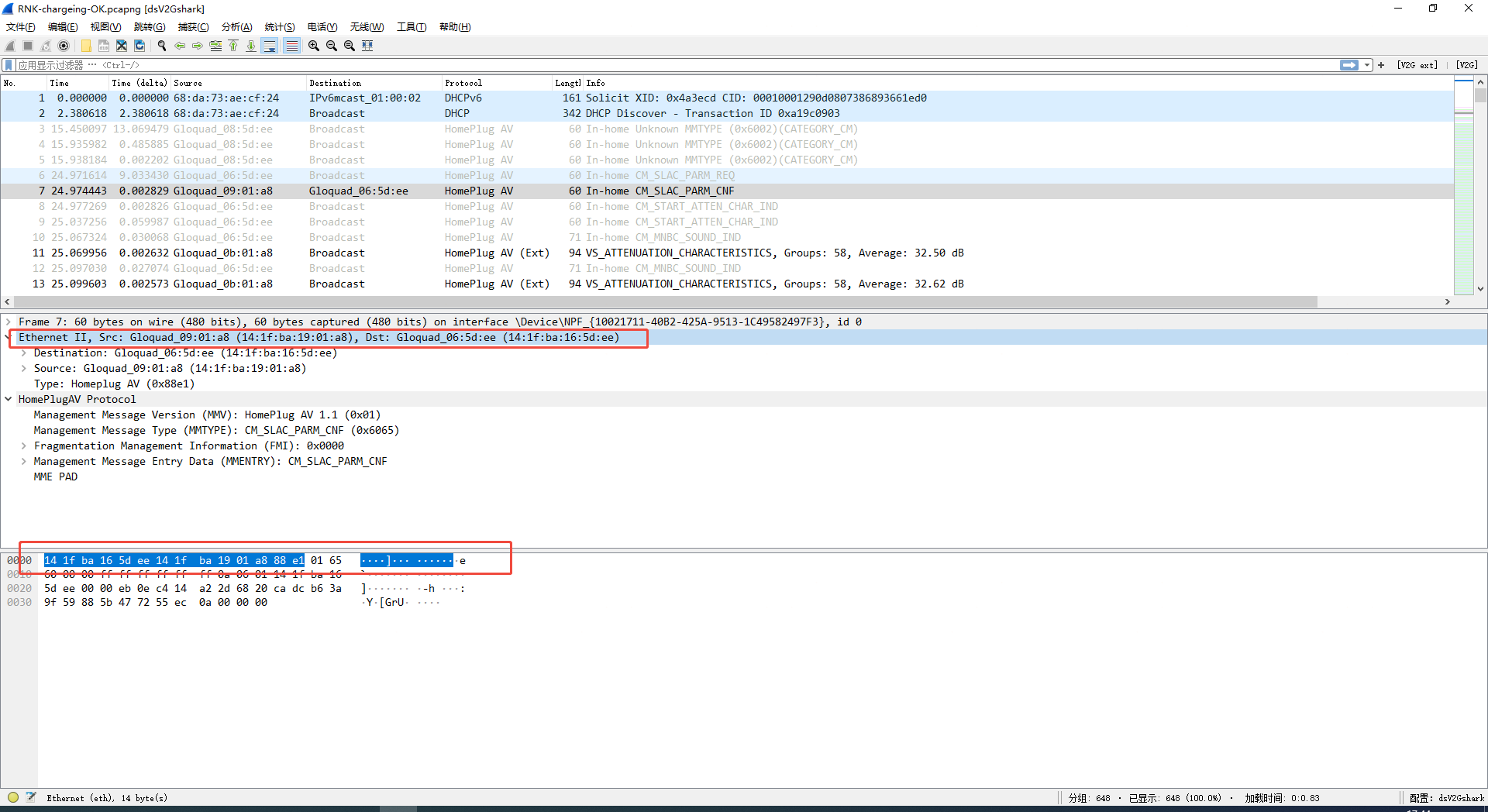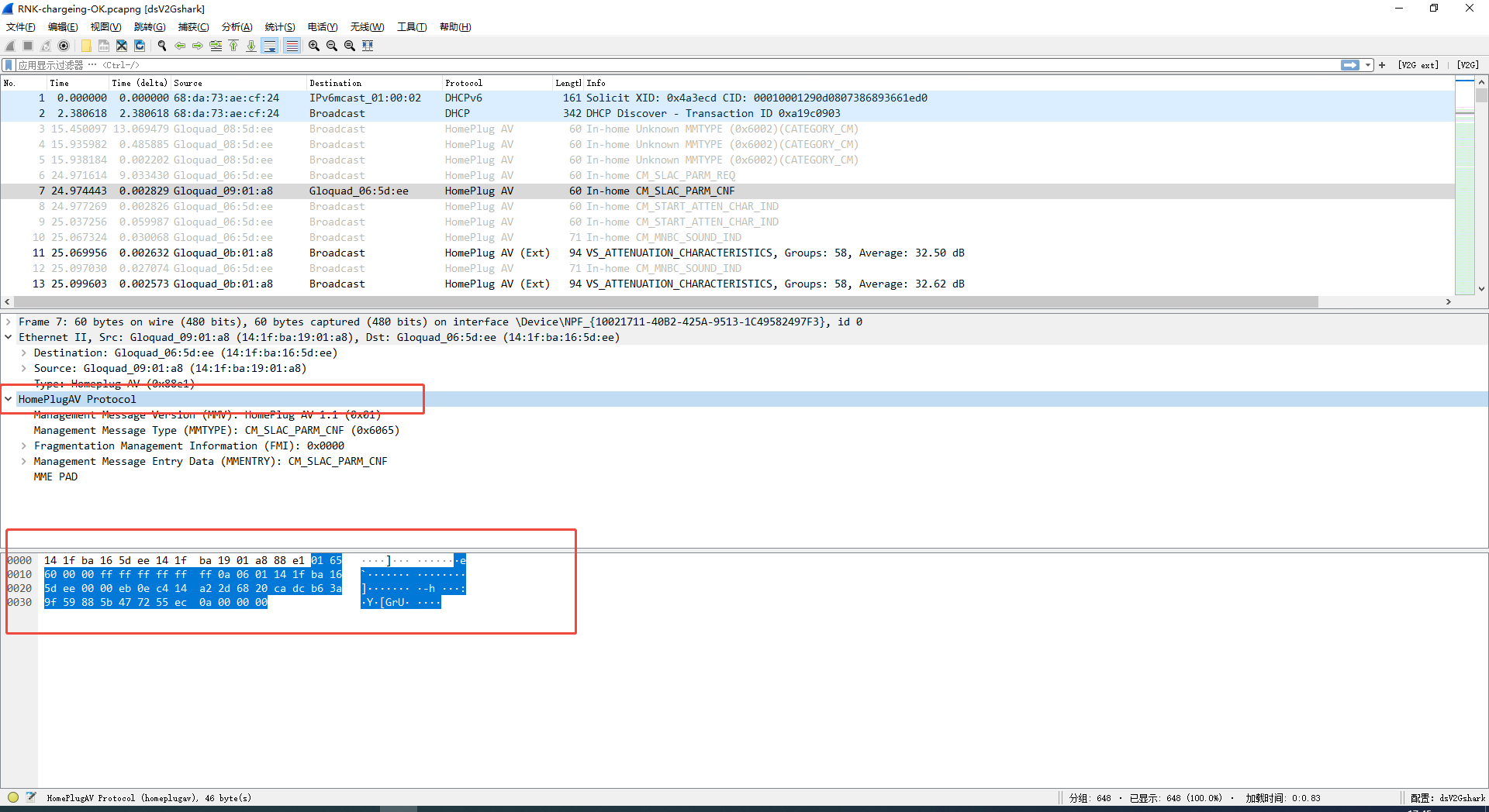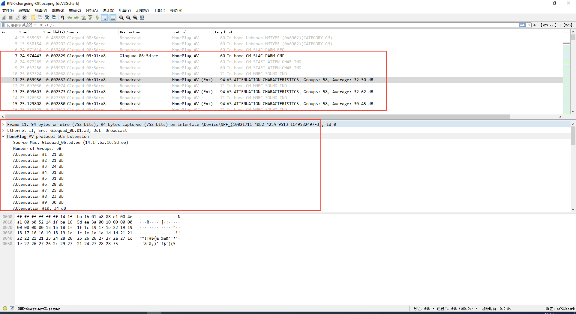 如图,可以看到SECC在持续发送Home Plug AV协议帧的广播包,包含信号强度等信息