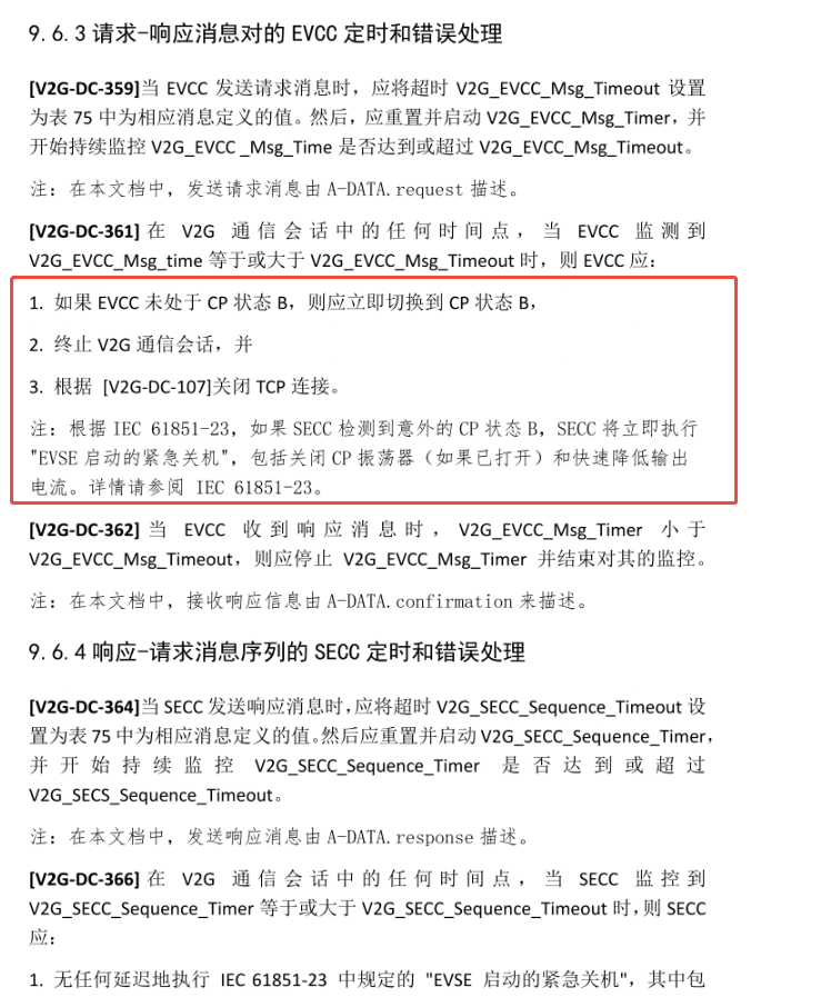 上面说到正常充电的流程,那异常处理.......当EVCC异常也好,SECC异常也好,相应的处理查看如图所在章节吧。比如说 EVCC 监测到异常,如红色框图的处理方式.......好了,自己看标准吧,偷懒加N。。。