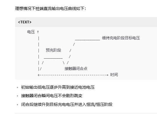 预充阶段逐步抬升EVSE的输出电压,直到与电池电压偏差小于20V的时候,才允许闭合继电器,根据IEC61851-23标准要求