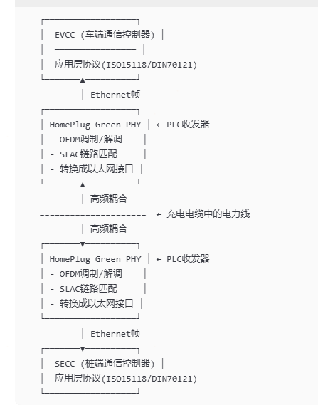 1、在 ISO15118 / DIN70121 的物理层中,车与桩之间的通信就是基于 HomePlug Green PHY 技术的 PLC,利用充电电缆的电力线来做数据传输。