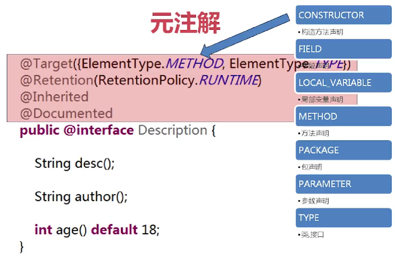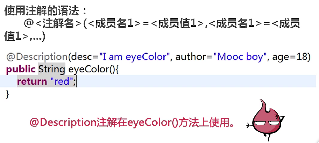 }//4.找到方法上的注解Method[] ms=c.getMethods();for(Method m:ms){boolean isExist=m.isAnnotation(Description.class);if(isExist){Description d=(Description)m.getAnnotation(Description.class);System.out.println(d.value())}}