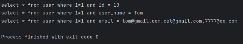 import java.lang.reflect.Method;public class Test {public static void main(String[] args) {Filter f1=new Filter();f1.setId(10);//查询ID为10的用户Filter f2=new Filter();f2.setUserName("Tom");//模糊查询用户名为Tom的用户Filter f3=new Filter();f3.setEmail("tom@gmail.com,cat@gmail.com,7777@qq.com");//查询邮箱为其中任意一个//查询sql语句String sql1=query(f1);String sql2=query(f2);String sql3=query(f3);//输出System.out.println(sql1);System.out.println(sql2);System.out.println(sql3);}private static String query(Filter f1) {//2.接下来我们就考虑如何实现query方法StringBuilder sb=new StringBuilder();//a.获取到classClass clazz=f1.getClass();//b.获取到table的名字boolean exists = clazz.isAnnotationPresent(Table.class);if(! exists){return null;}Table table= (Table) clazz.getAnnotation(Table.class);String tableName=table.value();sb.append("select * from ").append(tableName).append(" where 1=1");//c.获取到所有的字段Field[] fields=clazz.getDeclaredFields();for (Field field : fields){//4.处理每个字段对应的sql语句//4.1 获取到字段名boolean exists1 = field.isAnnotationPresent(Column.class);if(! exists1){continue;}Column column=field.getAnnotation(Column.class);String columnName=column.value();//4.2 获取字段值String fieldName = field.getName();String getMethodName = "get" + fieldName.substring(0,1).toUpperCase()+fieldName.substring(1);Object fieldValue=null;try {Method getMethod = clazz.getMethod(getMethodName);fieldValue =getMethod.invoke(f1);} catch (NoSuchMethodException | IllegalAccessException | InvocationTargetException e) {throw new RuntimeException(e);}//4.3拼装sql语句if(fieldValue==null||(fieldValue instanceof Integer && ((Integer) fieldValue).intValue()==0)){continue;}sb.append(" and ").append(columnName).append(" = ").append(fieldValue);}return sb.toString();}