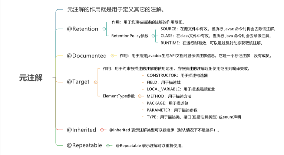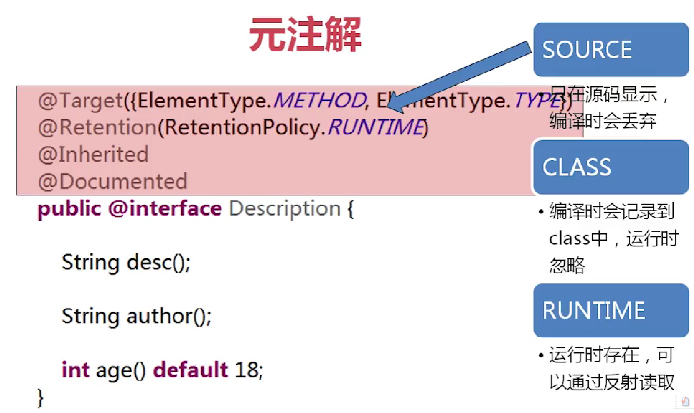 - 源码注解:注解只在源码中存在,编译成.class文件就不存在了