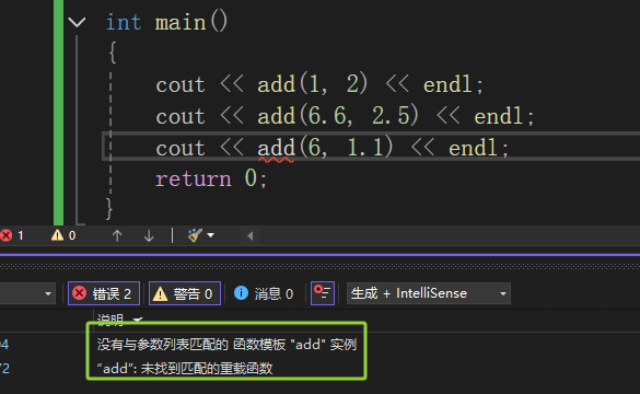 {cout << add(1, 2) << endl;cout << add(6.6, 2.5) << endl;cout << add(6, 1.1) << endl;return 0;