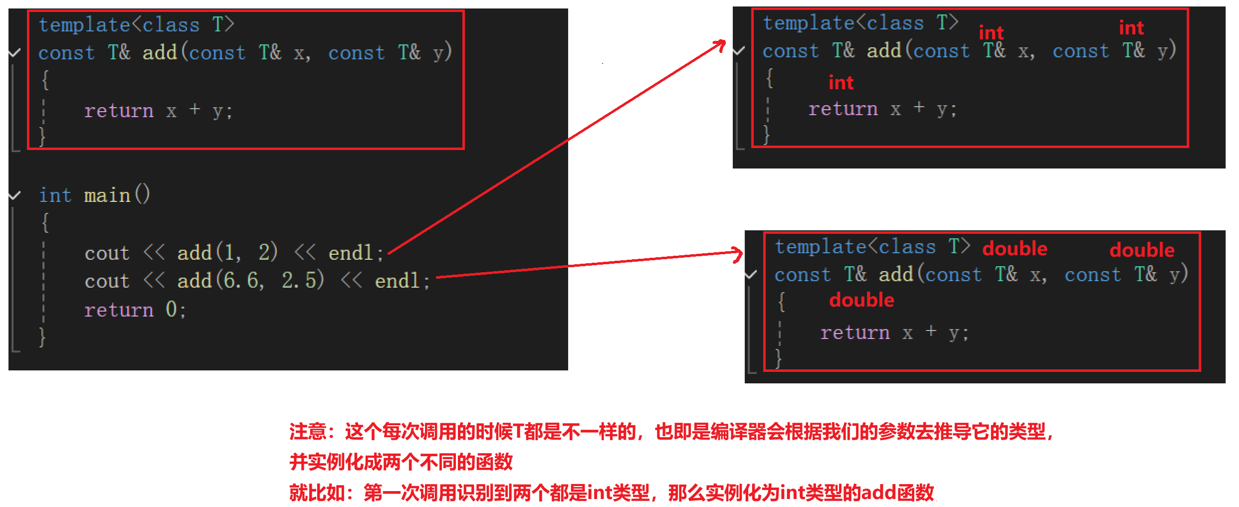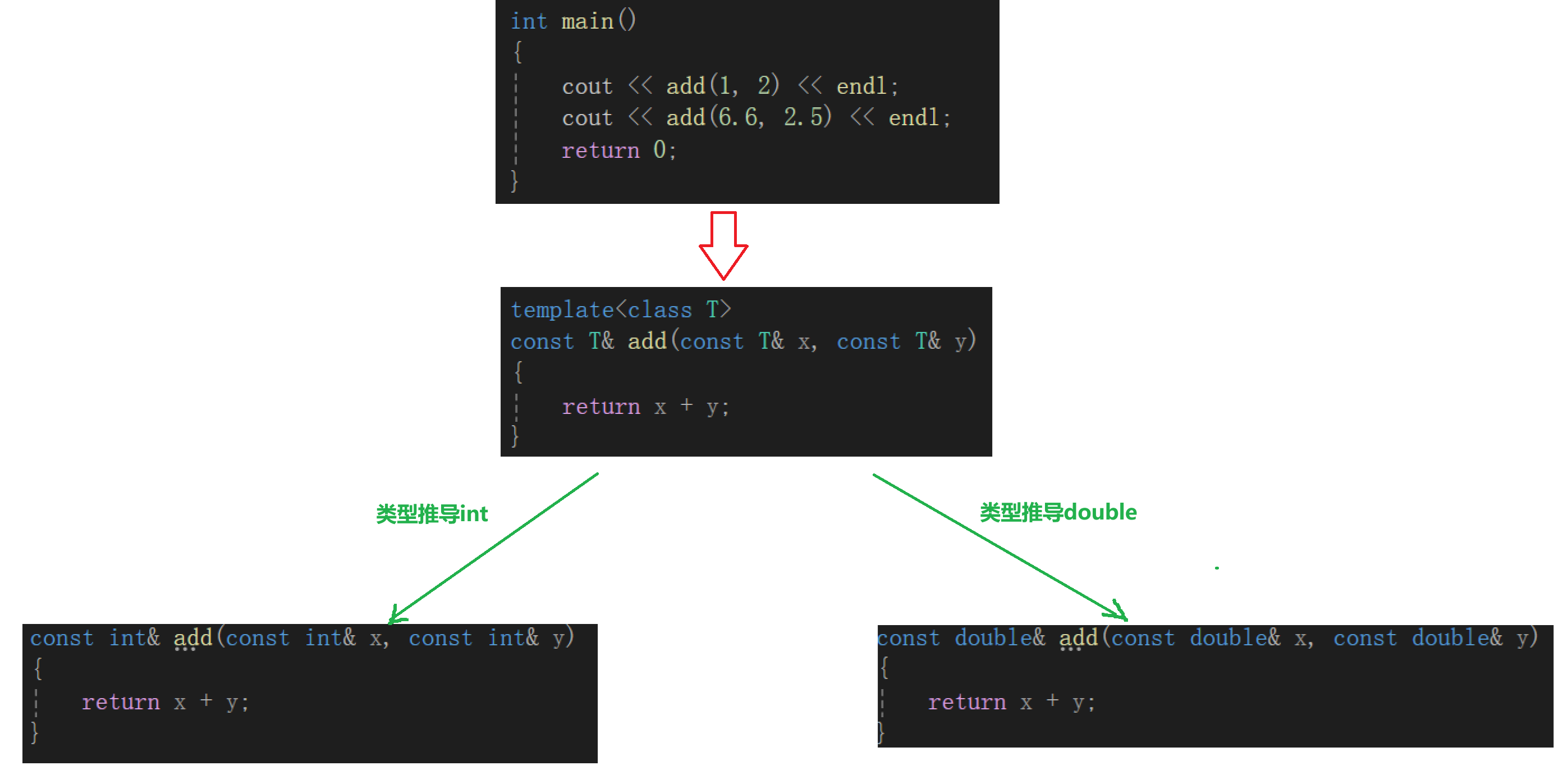 {cout << add(1, 2) << endl;//编译器将1和2推导为intcout << add(6.6, 2.5) << endl;//编译器将6.6和2.5推导为doublereturn 0;