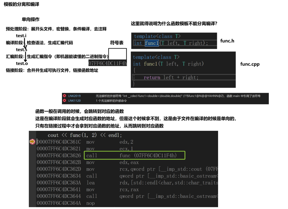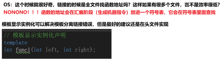 基于此函数距离编译还差一个实例化<T>,这个T只有.cpp知道,但是每个文件又是单向操作,我在编译的时候是不知道的,但是编译时头文件:就是告诉编译器,你不用管待会儿给你,你先运行,但是链接的时候我去找编译器要,欸没有,这不是欺诈吗?所以就会出现链接错误。
