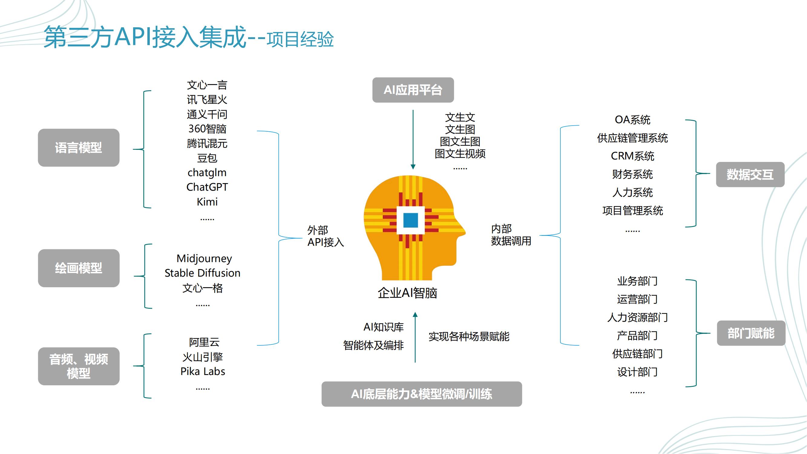 在数字化浪潮的推动下,人工智能(AI)正成为企业转型升级的重要驱动力。然而,企业在实际推进AI化转型的过程中,往往会面临技术与业务“两张皮”的问题——技术难以真正驱动业务变革,业务需求也无法有效反哺技术创新。这种割裂不仅影响了企业的智能化进程,还可能导致资源浪费和战略偏差。 企业智脑:技术与业务融合的枢纽 企业智脑是近年来新兴的概念,它不仅仅是简单的技术工具或平台,而是整合了AI、大数据、云计算等多种前沿技术的企业级智能中枢。通过企业智脑,企业可以实现技术与业务的深度结合,推动数字化转型迈向更高层次。 企业智脑的核心价值